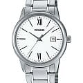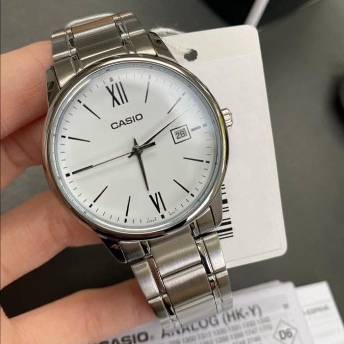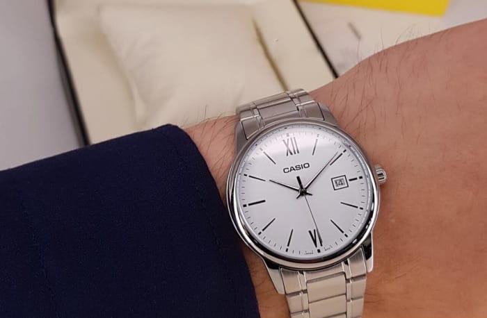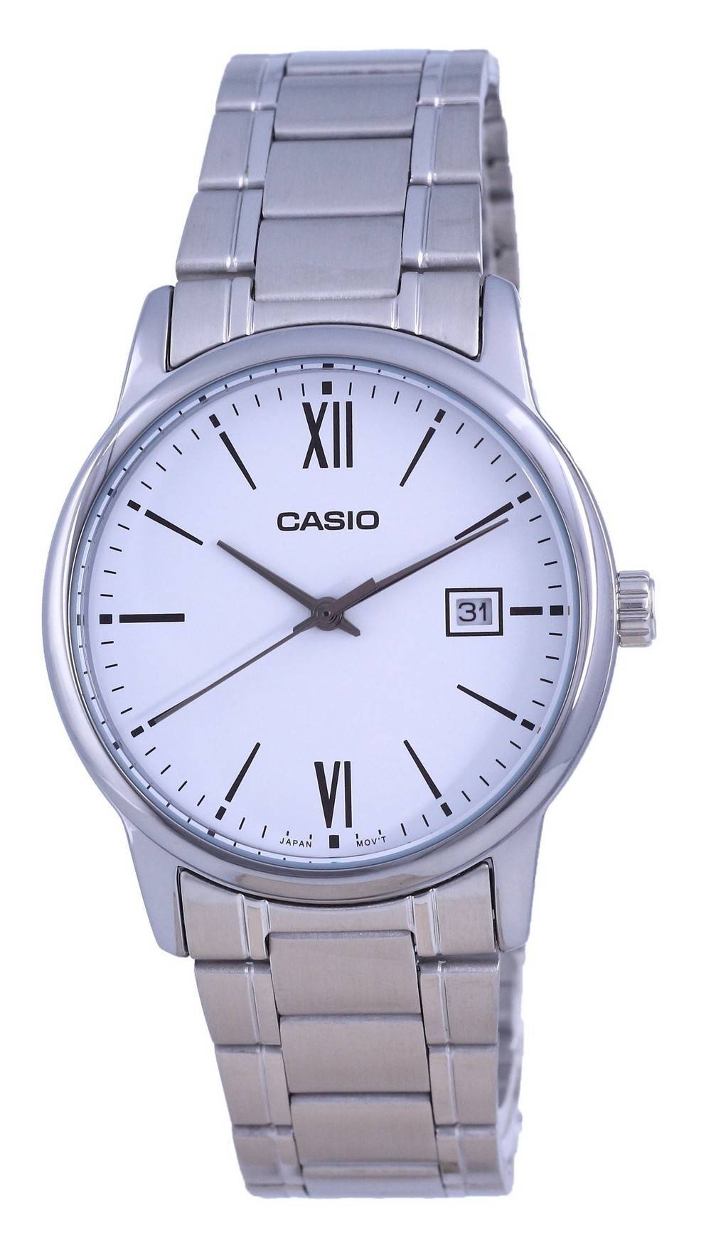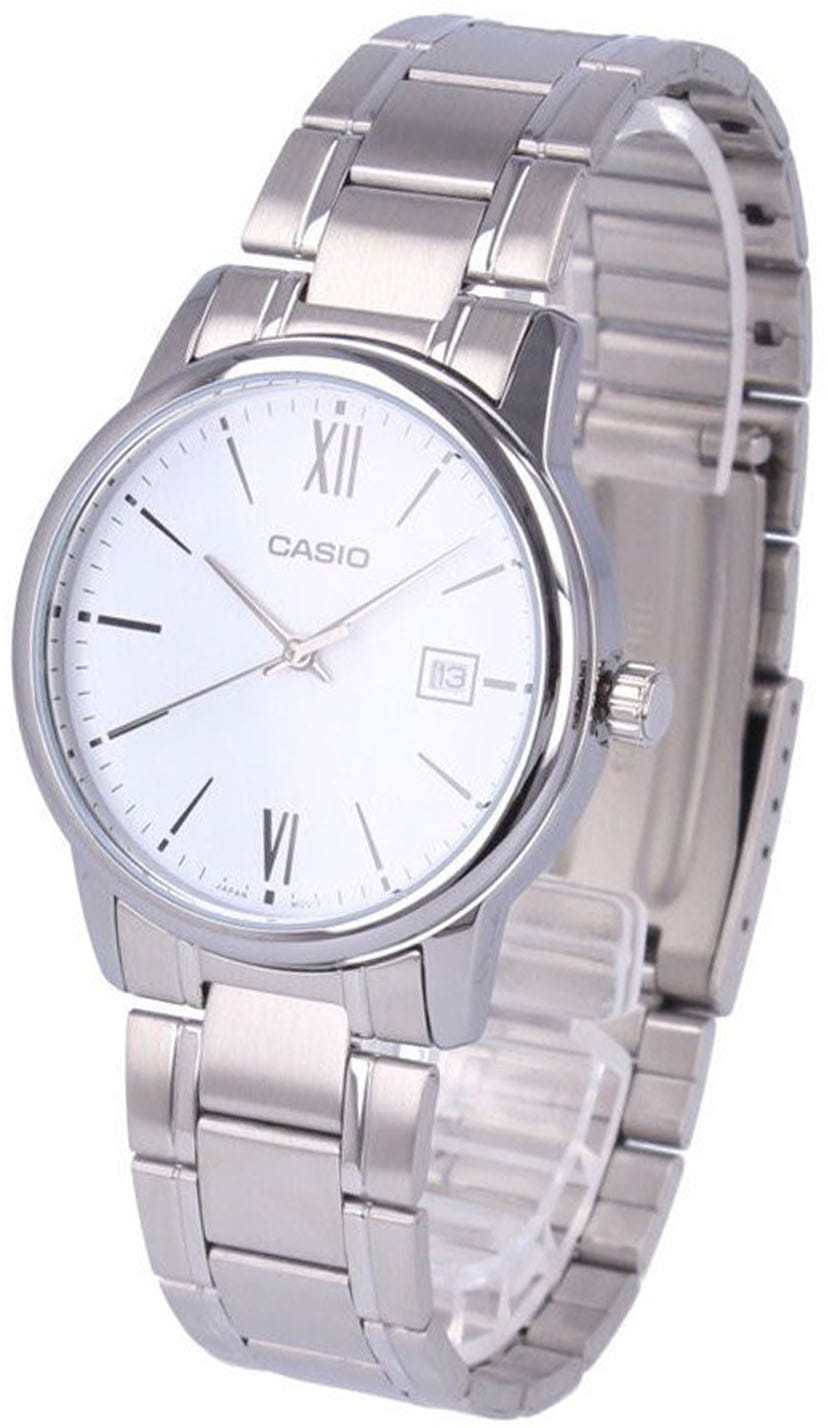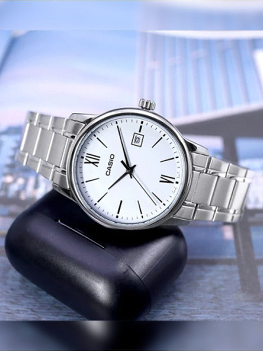 Японские мужские наручные часы с минеральным стекломМинеральное стеклоМинеральное стекло представляет собой искусственно выращенный минерал кварца. Такое стекло отличается особой устойчивостью к повреждениям и царапинам. Уступает по некоторым качествам сапфировому стеклу. Casio Collection MTP-V002D-7B3, кварцевый механизм с высокой точностью. Класс водозащиты: 30 метров, позволит защитить корпус от случайных брызг или капель дождя. Корпус часов изготовлен из стали. Стальной браслет на раскладной застёжкеРаскладная застёжкаТакой тип застёжки используется только на браслетах из металла. Она никогда не раскрывается полностью, происходит разделение на 2 и более частей. Раскладывающая застёжка снизит вероятность потери часов к минимуму.. Метки в виде штрихов и двух римских цифр.
