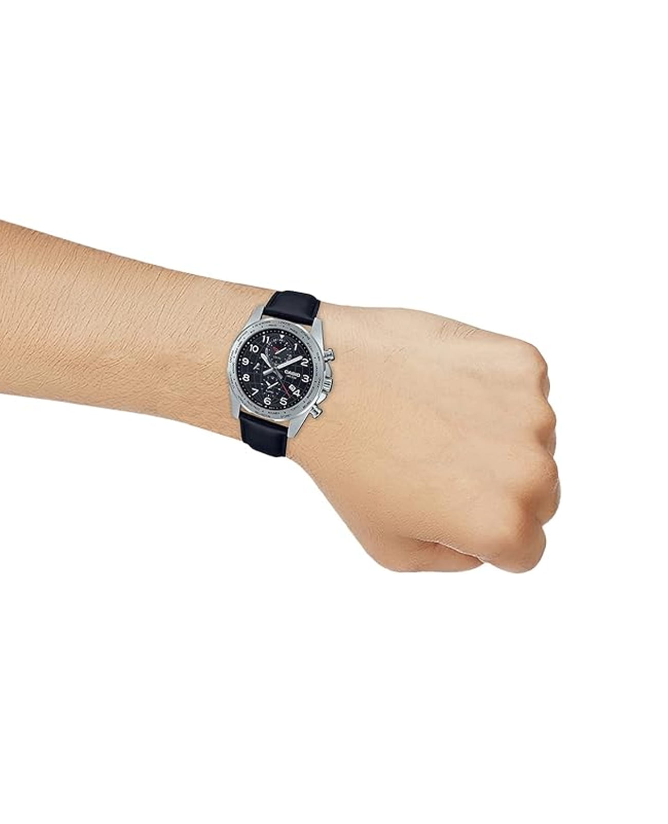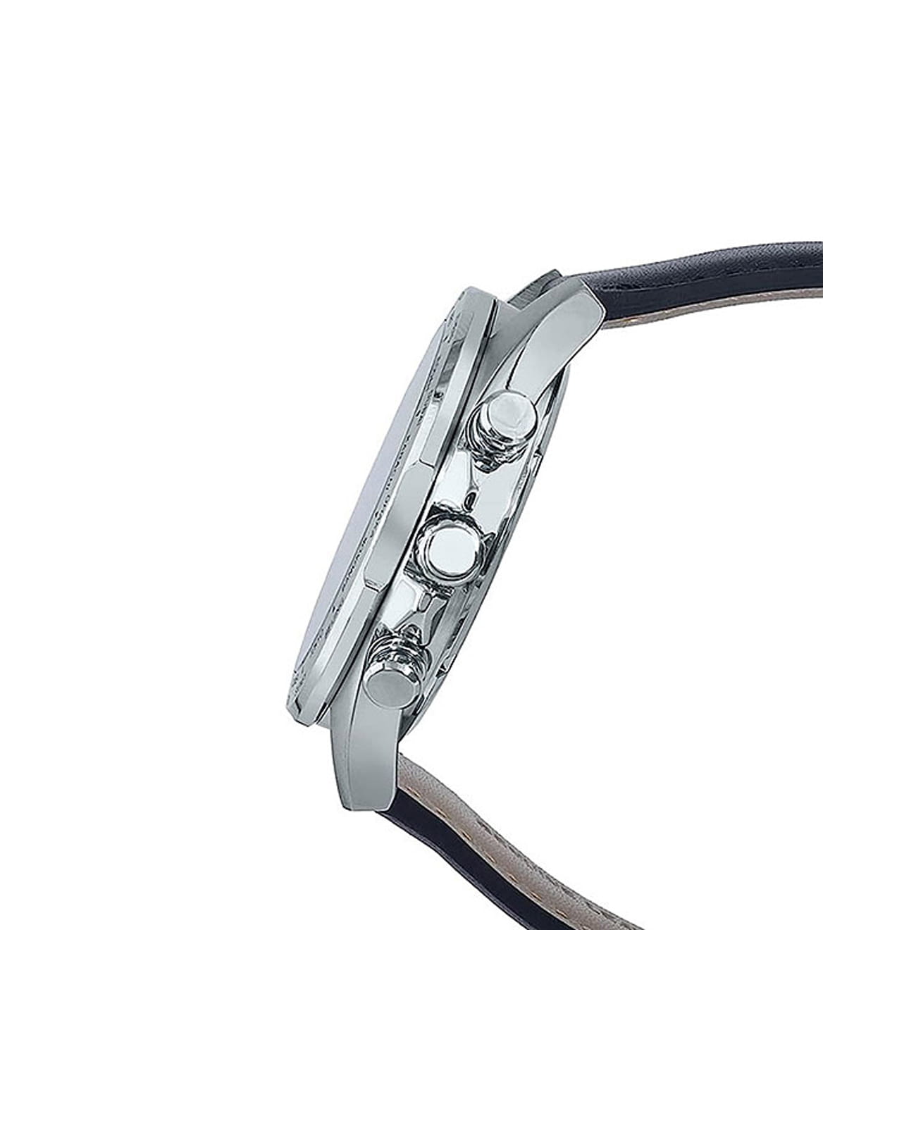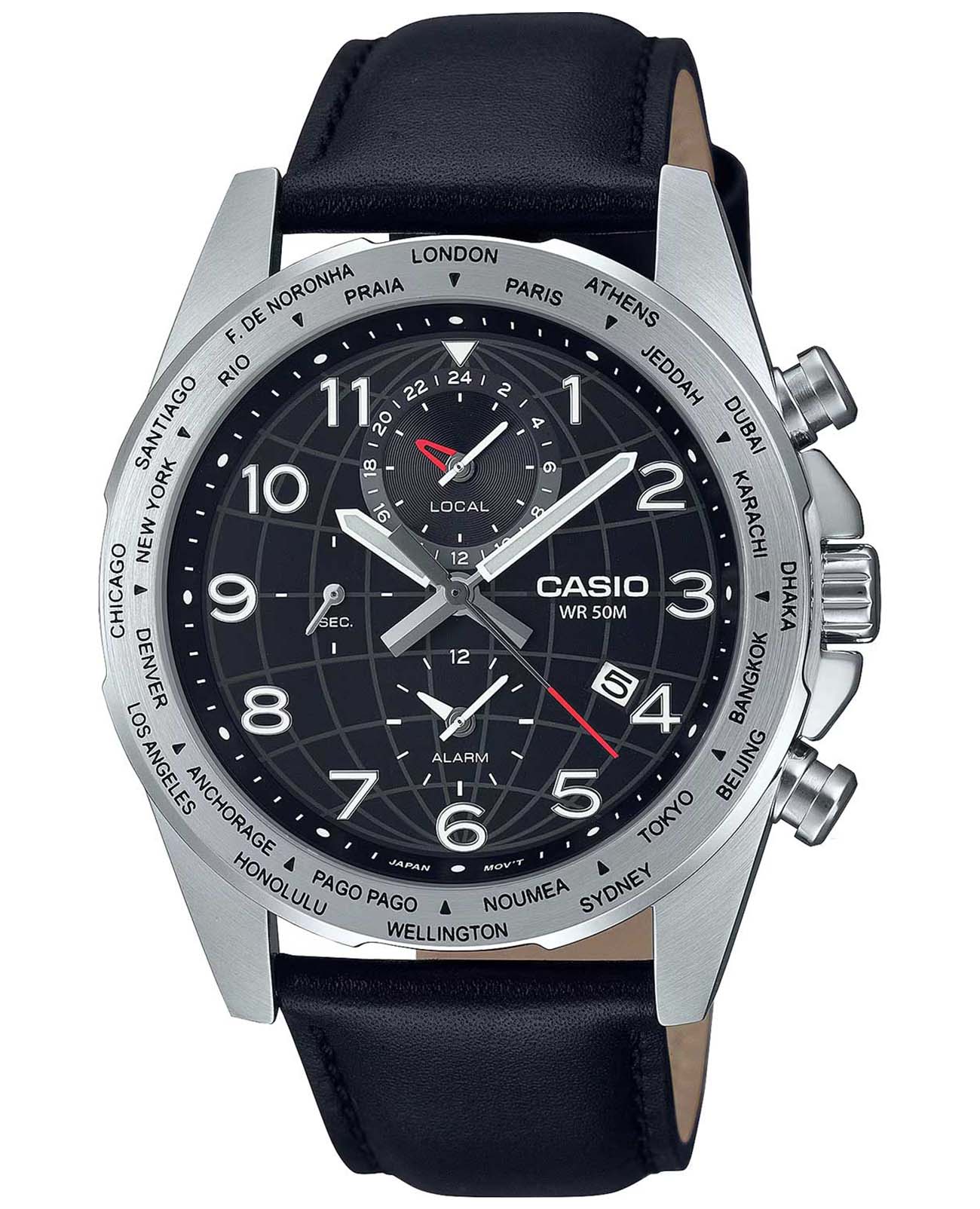 Японские мужские часы-хронографХронографФункция позволяет измерять отрезки времени с особой точностью: часы, минуты, секунды. Верным признаком хронографа является наличие на циферблате 3 дополнительных окошек-счётчиков. с секундомеромСекундомерСекундоме́р — прибор, способный измерять интервалы времени с точностью до долей секунды. Casio Collection MTP-W500L-1A, кварцевый механизм с высокой точностью. Класс водозащиты: 50 метров, позволит защитить корпус от случайных брызг или капель дождя. Корпус и браслет часов изготовлены из стали. Удобное отображение времени домашнего часового пояса и мирового времениМировое время Полезное часовое усложнение, отображающее время в основных городах и известных областях по всему миру, оно связано с часовыми поясами, удобно для путешественников и бизнесменов. (24 города - 24 зоны) позволяет ориентироваться при путешествиях. Кожаный ремешок на стандартной застёжке. БудильникБудильникБуди́льник — часы, в заданный момент времени подающие звуковой, световой и/или в редких случаях другой сигнал./ежечасный сигнал. Минеральное стеклоМинеральное стеклоМинеральное стекло представляет собой искусственно выращенный минерал кварца. Такое стекло отличается особой устойчивостью к повреждениям и царапинам. Уступает по некоторым качествам сапфировому стеклу. устойчивое к мелким механическим повреждениям. Центральные часовая, минутная и секундная стрелки. Индикатор низкого заряда батареи. Синий циферблат с часовыми индексами в виде штрихов и цифр. Стрелки и метки с люминесцентным покрытиемЛюминесцентное покрытиеПозволяет считывать показания времени в темноте. Производители наносят на стрелки, часовые индексы, безель или поверхность циферблата светонакопительный состав, дающий холодное свечение..
