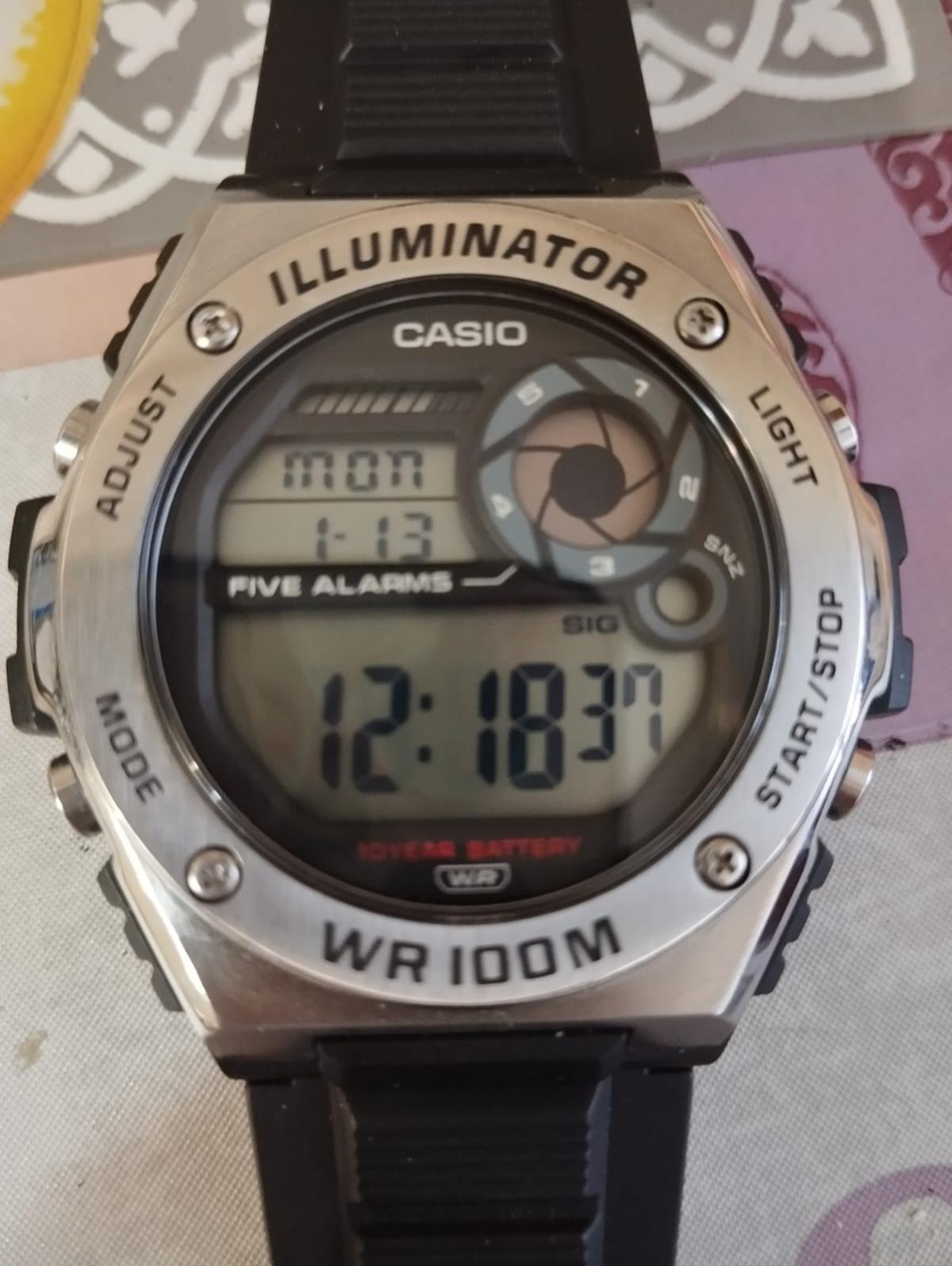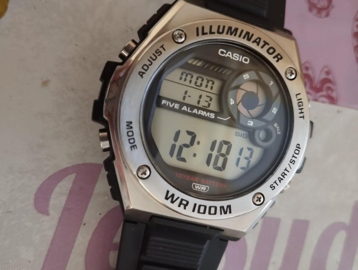 Спортивные японские мужские часы-хронографХронографФункция позволяет измерять отрезки времени с особой точностью: часы, минуты, секунды. Верным признаком хронографа является наличие на циферблате 3 дополнительных окошек-счётчиков. Casio Collection MWD-100H-1A, кварцевый механизм с высокой точностью, органическое стекло. Корпус часов изготовлен из стали и пластика. Светодиодная подсветкаСветодиодная подсветкаСветодиодная или LED-подсветка обеспечивает появление яркого холодного свечения за счёт LED-элементов - маленьких лампочек. Они потребляют минимальное количество энергии, чаще всего можно встретить 1 светодиод, в нижней части циферблата. освещает весь циферблат. Цвет подсветки: оранжевый. 12-ти и 24-х часовой формат времени. СекундомерСекундомерСекундоме́р — прибор, способный измерять интервалы времени с точностью до долей секунды. с точностью показаний 1/100с и временем измерения 1ч. Сплит-хронографСплит-хронографИспользуется для измерения продолжительности нескольких временных отрезков, начинающихся одновременно, а заканчивающихся в разное время.. Батарейка рассчитана на 10 лет. ТаймерТаймерОтсчитывает секунды в обратном направлении в заданном интервале времени. обратного отсчета от 1мин до 24ч. 5 будильниковБудильникБуди́льник — часы, в заданный момент времени подающие звуковой, световой и/или в редких случаях другой сигнал., один с функцией Snooze, ежечасный сигнал. Класс водозащиты: 100 метров, позволит плавать, нырять и заниматься другими водными видами спорта. Ремешок из полимерного материала на стандартной застежке.