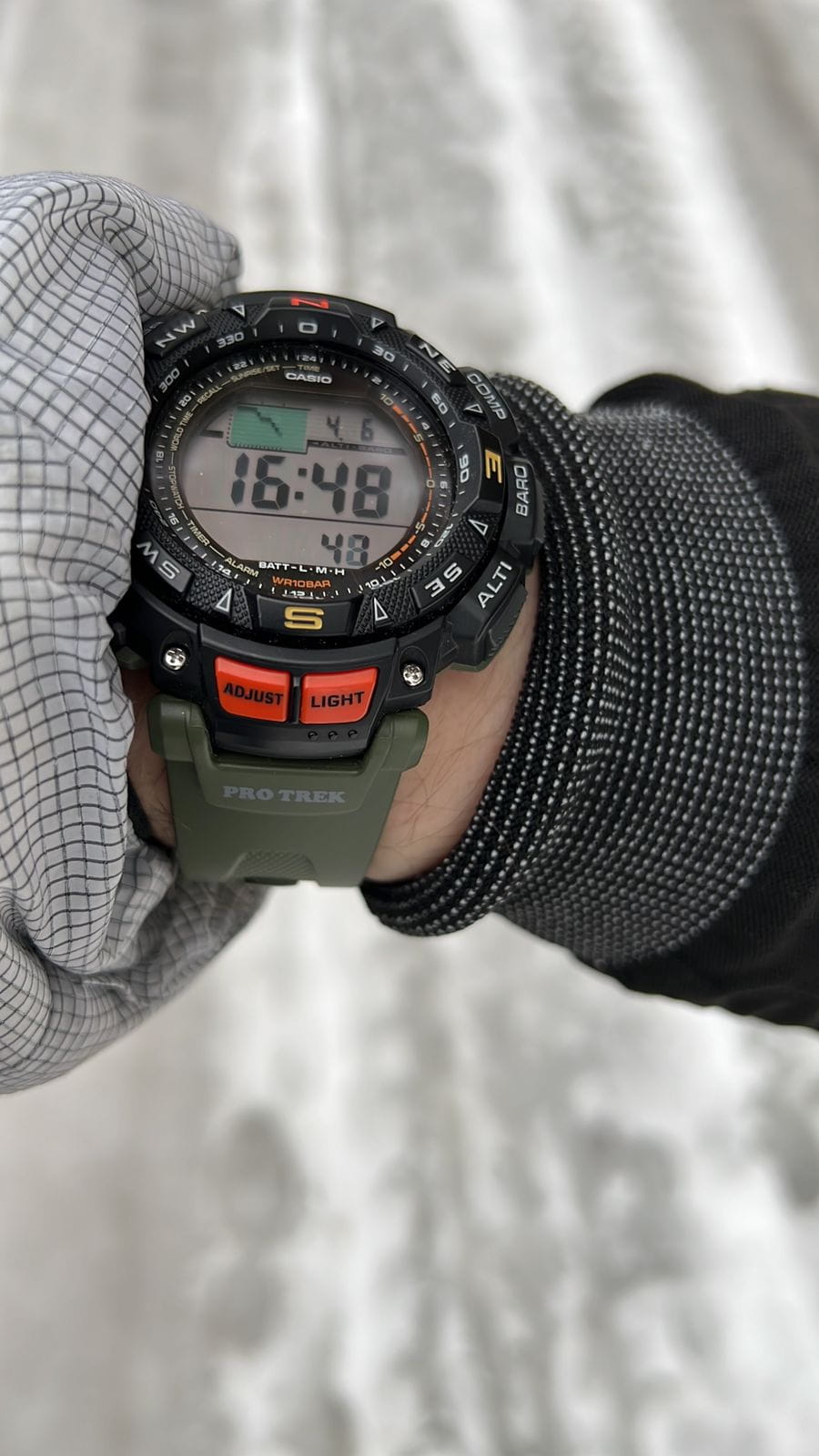 Функциональная модель с зелёными и оранжевыми акцентами обладает расширенными возможностями. Каждое усложнение направляет усилия на то, чтобы ваше путешествие прошло легко и насыщенно. Среди функций компас, барометр, индикатор температуры, мировое времяМировое время Полезное часовое усложнение, отображающее время в основных городах и известных областях по всему миру, оно связано с часовыми поясами, удобно для путешественников и бизнесменов. , график восхода и заката солнца, высотомер, таймер. Японский кварцевый механизм. Технология . Индикатор состояния заряда батареи. Электролюминесцентная подсветкаЭлектролюминесцентная подсветкаЭлектролюминесцентная панель устанавливается под ЖК-экраном часов, при нажатии кнопки электричество преобразуется в свет за счёт подачи напряжения на атомы фосфора, такой тип подсветки позволяет освещать весь циферблат. циферблата. Ударопрочный корпусУдаропрочный корпусМеханизм заключён в корпус, выполненный из современных материалов, устойчивых к ударам, механическим повреждениям и падению с высоты: инновационный пластик, карбон, нержавеющая сталь, титан. и ремешок из полимерного материала. Вращающийся безельБезельВнешний ободок, закрепляющий стекло. В спортивных часах так называется поворотное кольцо с делениями на циферблате, выполняет роль таймера – замеряет отрезки времени на шкале. Неподвижный безель – элемент декора. Однонаправленно вращающийся безель на дайверских часах позволяет фиксировать моменты погружения и выныривания на поверхность.. Минеральное стекло. Водостойкость до 10 бар. Устойчивость к температуре ниже -10°C. Габариты: 57,3 x 50,9 x 15,3 мм.