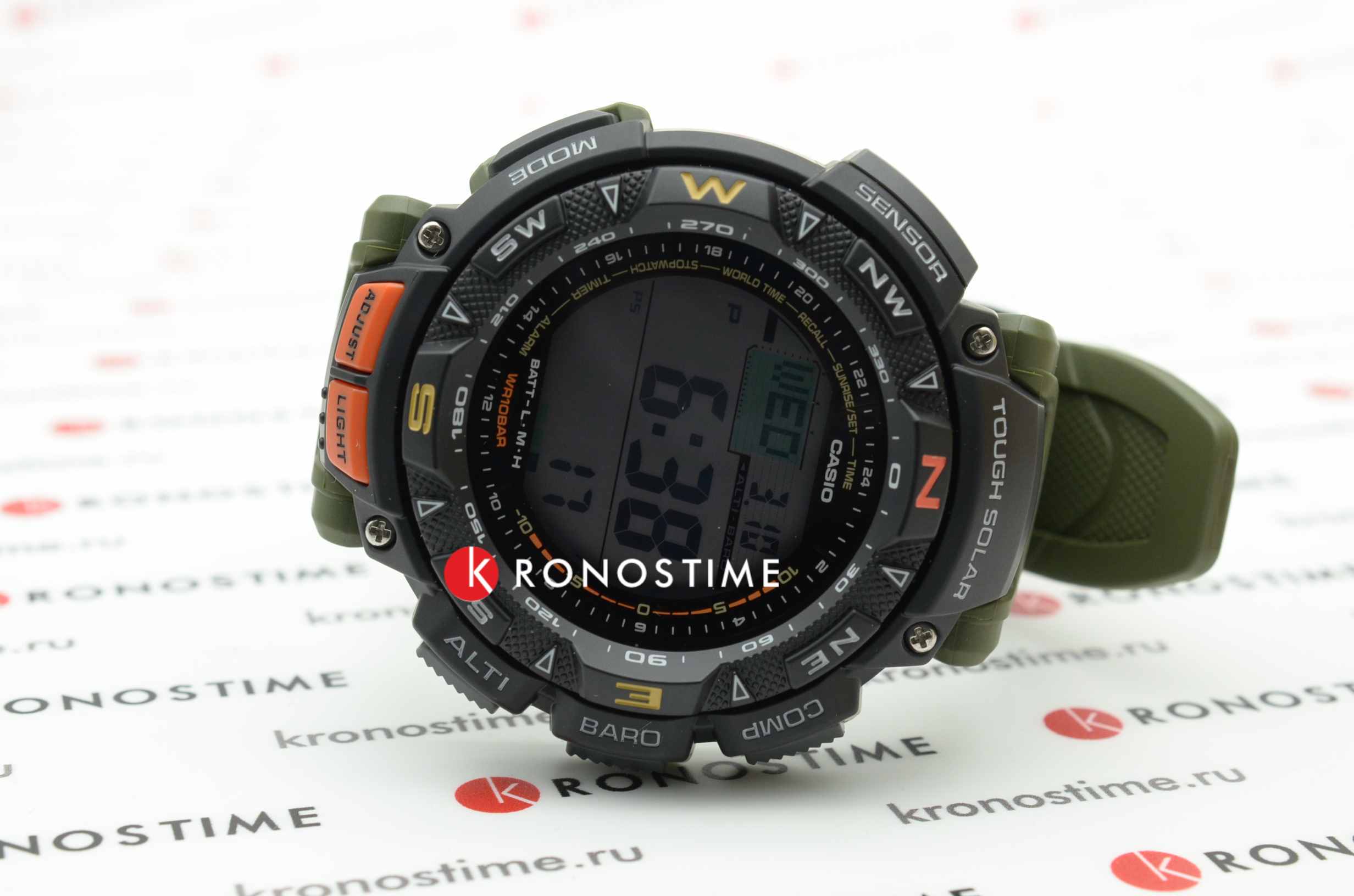 Функциональная модель с зелёными и оранжевыми акцентами обладает расширенными возможностями. Каждое усложнение направляет усилия на то, чтобы ваше путешествие прошло легко и насыщенно. Среди функций компас, барометр, индикатор температуры, мировое времяМировое время Полезное часовое усложнение, отображающее время в основных городах и известных областях по всему миру, оно связано с часовыми поясами, удобно для путешественников и бизнесменов. , график восхода и заката солнца, высотомер, таймер. Японский кварцевый механизм. Технология . Индикатор состояния заряда батареи. Электролюминесцентная подсветкаЭлектролюминесцентная подсветкаЭлектролюминесцентная панель устанавливается под ЖК-экраном часов, при нажатии кнопки электричество преобразуется в свет за счёт подачи напряжения на атомы фосфора, такой тип подсветки позволяет освещать весь циферблат. циферблата. Ударопрочный корпусУдаропрочный корпусМеханизм заключён в корпус, выполненный из современных материалов, устойчивых к ударам, механическим повреждениям и падению с высоты: инновационный пластик, карбон, нержавеющая сталь, титан. и ремешок из полимерного материала. Вращающийся безельБезельВнешний ободок, закрепляющий стекло. В спортивных часах так называется поворотное кольцо с делениями на циферблате, выполняет роль таймера – замеряет отрезки времени на шкале. Неподвижный безель – элемент декора. Однонаправленно вращающийся безель на дайверских часах позволяет фиксировать моменты погружения и выныривания на поверхность.. Минеральное стекло. Водостойкость до 10 бар. Устойчивость к температуре ниже -10°C. Габариты: 57,3 x 50,9 x 15,3 мм.