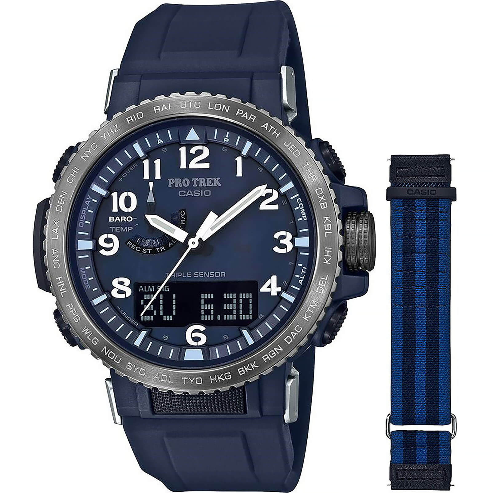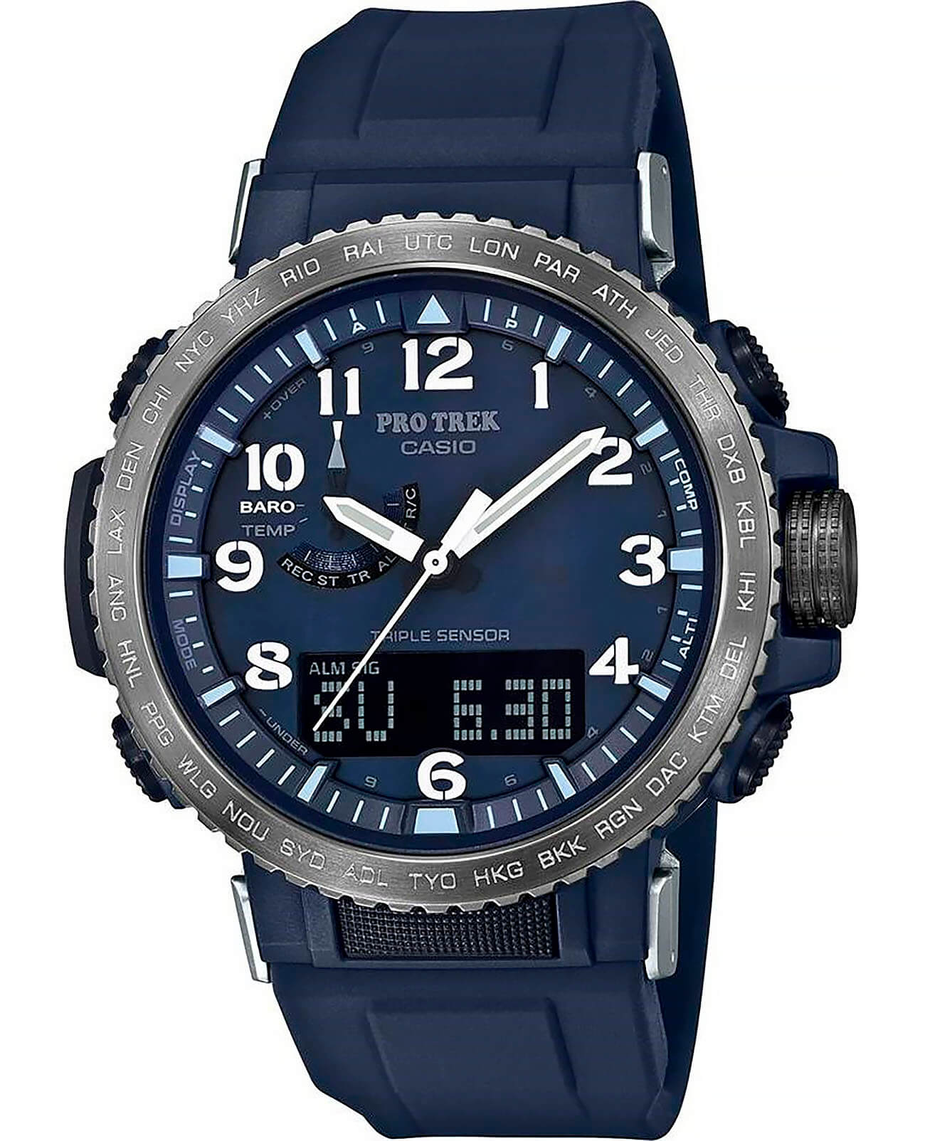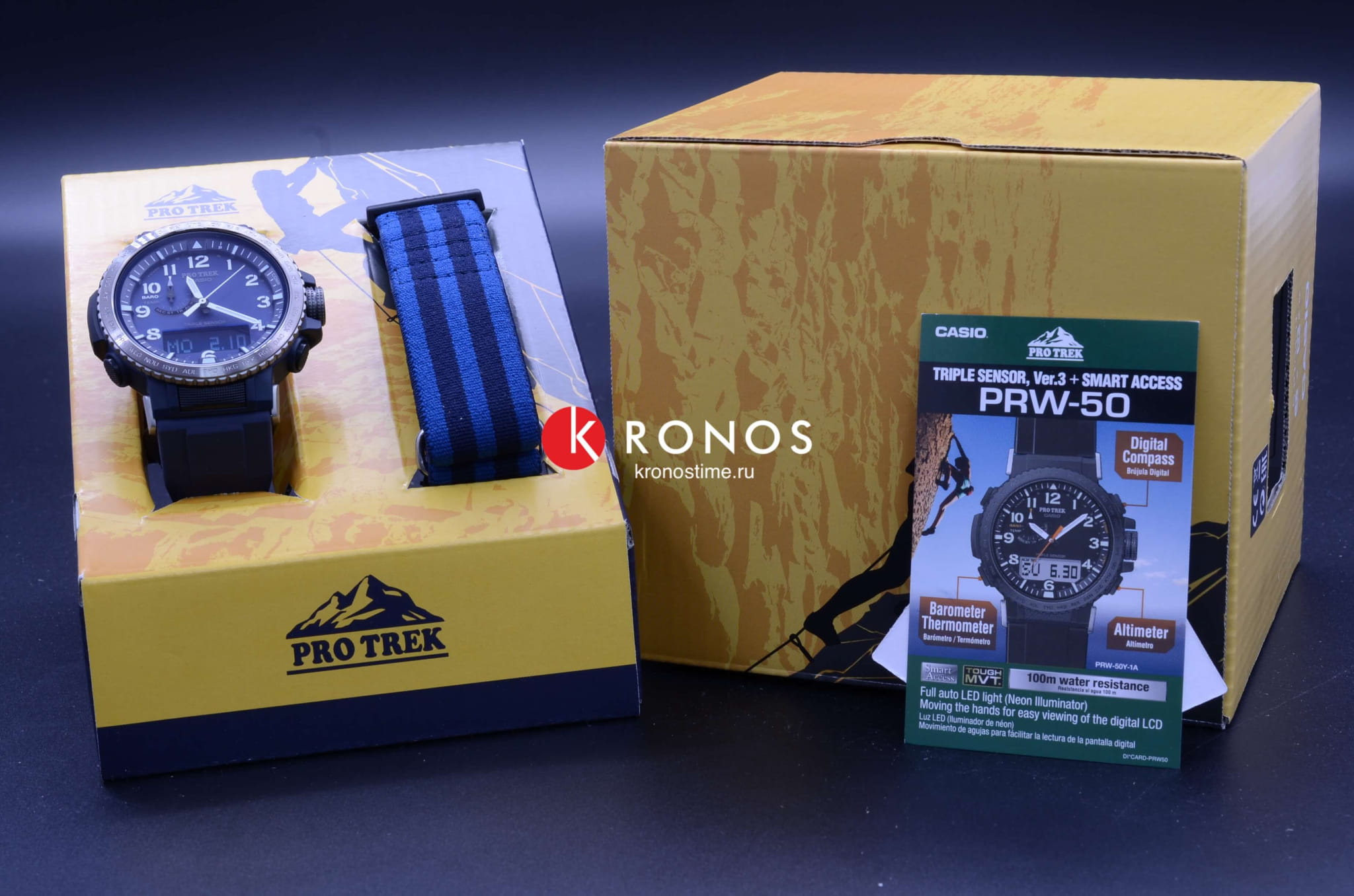 Ударопрочный корпусУдаропрочный корпусМеханизм заключён в корпус, выполненный из современных материалов, устойчивых к ударам, механическим повреждениям и падению с высоты: инновационный пластик, карбон, нержавеющая сталь, титан. из пластика надёжно защищает японский кварцевый механизм и внутреннюю «начинку», объединяющую полезные функции. Это барометр, компас, таймер, хронографХронографФункция позволяет измерять отрезки времени с особой точностью: часы, минуты, секунды. Верным признаком хронографа является наличие на циферблате 3 дополнительных окошек-счётчиков., термометр -10°C /+60°C, высотомер с графиком набора высоты, секундомер, мировое времяМировое время Полезное часовое усложнение, отображающее время в основных городах и известных областях по всему миру, оно связано с часовыми поясами, удобно для путешественников и бизнесменов. – 29 часовых поясов, 5 будильников, автоматический календарь, коррекция времени с помощью радиосигнала. Солнечная батарея повышенной мощности. Стальной безельБезельВнешний ободок, закрепляющий стекло. В спортивных часах так называется поворотное кольцо с делениями на циферблате, выполняет роль таймера – замеряет отрезки времени на шкале. Неподвижный безель – элемент декора. Однонаправленно вращающийся безель на дайверских часах позволяет фиксировать моменты погружения и выныривания на поверхность. c IP-покрытиемIP-покрытиеМетод ионного напыления. Демонстрирует повышенную устойчивость к истиранию, окислению и химическим веществам. Под воздействием высокого давления и температуры около 1500°C молекулы металла надёжно соединяются с частицами корпуса часов.. Закаленное минеральное стекло. Защищённая заводная головка. Класс водозащиты WR 100. Двойная светодиодная подсветкаСветодиодная подсветкаСветодиодная или LED-подсветка обеспечивает появление яркого холодного свечения за счёт LED-элементов - маленьких лампочек. Они потребляют минимальное количество энергии, чаще всего можно встретить 1 светодиод, в нижней части циферблата. дисплея и циферблата. Люминесцентная подсветка NeobriteПодсветка NeobriteИспользование светонакопительных составов на основе сульфида цинка или алюмината стронция, яркий свет можно наблюдать на протяжении 6-10 часов после «зарядки» часов около источника света. для стрелок. В комплектацию включены 2 ремешка, полимерный и текстильный. Габариты: 50,5 x 47,2 x 13,3 мм.