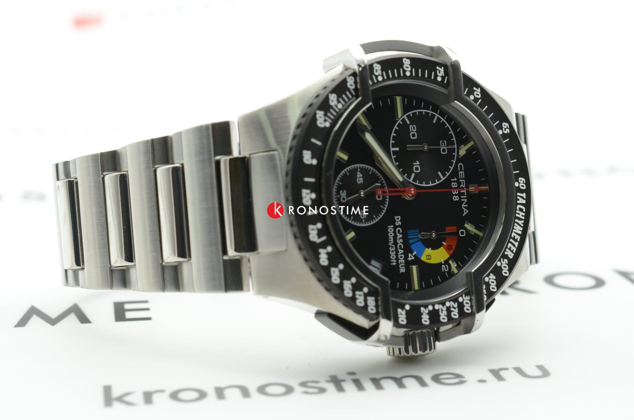 Надёжный корпус основан на концепции Двойной Надёжности DSDS ConceptDouble Security Concept, обозначает двойную надёжность и безупречную точность часов Certina. Двойная система защиты подразумевает обеспечение максимальной устойчивости к ударам и высоких показателей водонепроницаемости., выполнен из стали 316L с частичным PVD-финишемPVDУльтратонкое покрытие наносится в технике вакуумного напыления, сочетает в себе нитрид титана особой прочности со слоем золота или оксида хрома. Несёт в себе декоративную или защитную функцию.. Модель оснащена тахиметромТахиметрРазмеченная шкала, располагается на ободке или безеле часов. Тахиметр позволяет рассчитать скорость на определённом участке пути, расстояние измеряется в километрах или милях., секундомером, календарём, хронографомХронографФункция позволяет измерять отрезки времени с особой точностью: часы, минуты, секунды. Верным признаком хронографа является наличие на циферблате 3 дополнительных окошек-счётчиков.. Работу часов обеспечивает швейцарский кварцевый калибр ETA G10.211.