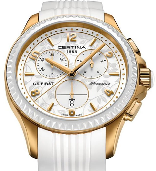 Женские швейцарские часы с сапфировым стеклом Certina C030.217.37.037.00, с белым каучуковым ремешком отлично дополнят Ваш повседневный образ. Сапфировое стекло устойчивое к появлению царапин, обладающее высокой прозрачностью. Класс водозащиты: 100 метров, позволит плавать, нырять и заниматься другими водными видами спорта. Корпус часов изготовлен из стали, позолоченного цвета.