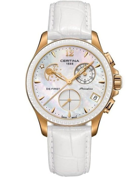 Утончённый перламутровый циферблат поможет отразить вашу женственную натуру, а также стремление окружить себя стильными вещами. Привлекательно смотрятся оригинально оформленные окошки-счётчики. Индикатор в положении 10 часов отображает лунные фазы, добавляя модели изысканности вместе с миниатюрной бриллиантовой звездой. Высокоточный кварцевый механизм G10.962 BH Precidrive™Precidrive™Инновационный кварцевый механизм Certina. Часы, оснащённые этим швейцарским калибром, приравниваются к точности к сертифицированным хронометрам, точность хода составляет +/-10 секунд в год. производства Швейцарии. Гранёный керамический безельБезельВнешний ободок, закрепляющий стекло. В спортивных часах так называется поворотное кольцо с делениями на циферблате, выполняет роль таймера – замеряет отрезки времени на шкале. Неподвижный безель – элемент декора. Однонаправленно вращающийся безель на дайверских часах позволяет фиксировать моменты погружения и выныривания на поверхность.. Сапфировое стекло с двухсторонним антибликовым покрытием. Корпус из стали 316L с PVD-финишемPVDУльтратонкое покрытие наносится в технике вакуумного напыления, сочетает в себе нитрид титана особой прочности со слоем золота или оксида хрома. Несёт в себе декоративную или защитную функцию.. Белый кожаный ремешок. Водостойкость 10 бар. . Функция EOLEOLПредставляет собой систему, уведомляющую владельца часов о необходимости замены элемента питания. За 2 недели до полного разряда батарейки секундная стрелка перестаёт ходить чётко и начинает перепрыгивать на 3-4 деления., календарь, хронографХронографФункция позволяет измерять отрезки времени с особой точностью: часы, минуты, секунды. Верным признаком хронографа является наличие на циферблате 3 дополнительных окошек-счётчиков.. Диаметр корпуса: 38 мм.