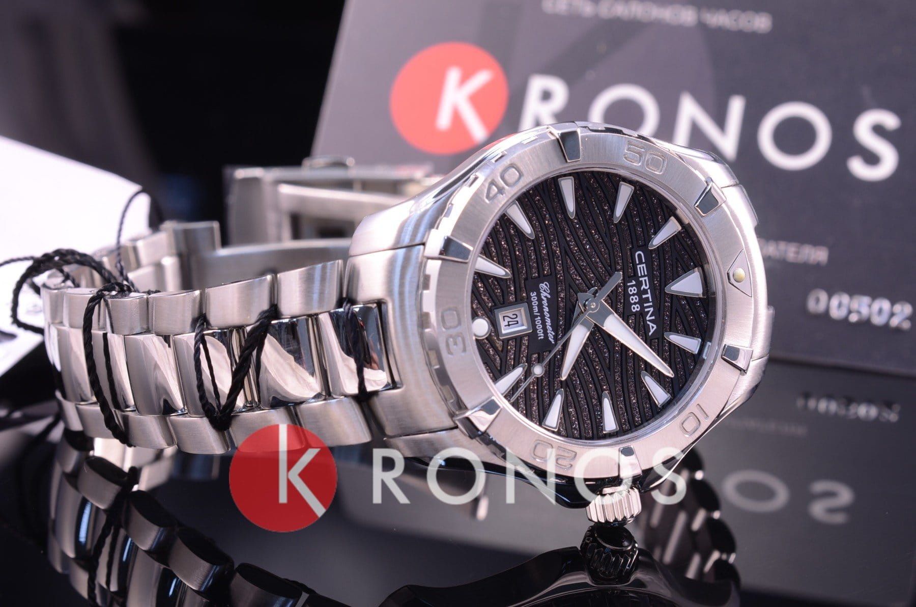 Компактный циферблат дополнен необычным узором в виде волн с блестящими акцентами, что стало выражением любви бренда Certina к морской стихии. Изящный аксессуар внутри просто «кремень», чему способствует система DS ConceptDS ConceptDouble Security Concept, обозначает двойную надёжность и безупречную точность часов Certina. Двойная система защиты подразумевает обеспечение максимальной устойчивости к ударам и высоких показателей водонепроницаемости.: водонепроницаемость 300 метров, завинчивающаяся задняя крышка и заводная головка с системой блокировки, сапфировое стекло, хирургическая сталь 316L. Швейцарский кварцевый механизм ETA F04.411 Precidrive™Precidrive™Инновационный кварцевый механизм Certina. Часы, оснащённые этим швейцарским калибром, приравниваются к точности к сертифицированным хронометрам, точность хода составляет +/-10 секунд в год. отмечен сертификатом хронометра COSCСертификат COSCОфициальный сертификат, подтверждающий то, что часы ходят с особо высокой точностью. Для получения документа часы подвергаются тестовым испытаниям, разработанным швейцарским институтом тестирования хронометров COSC. Допустимая норма для механических часов -4/+6 секунд в день, для кварцевых моделей +/- 0,07 секунд в день. за безупречную точность хода. Вращающийся безельБезельВнешний ободок, закрепляющий стекло. В спортивных часах так называется поворотное кольцо с делениями на циферблате, выполняет роль таймера – замеряет отрезки времени на шкале. Неподвижный безель – элемент декора. Однонаправленно вращающийся безель на дайверских часах позволяет фиксировать моменты погружения и выныривания на поверхность.. Яркая люминесцентная подсветкаЛюминесцентное покрытиеПозволяет считывать показания времени в темноте. Производители наносят на стрелки, часовые индексы, безель или поверхность циферблата светонакопительный состав, дающий холодное свечение.. Апертура даты, функция EOLEOLПредставляет собой систему, уведомляющую владельца часов о необходимости замены элемента питания. За 2 недели до полного разряда батарейки секундная стрелка перестаёт ходить чётко и начинает перепрыгивать на 3-4 деления.. Диаметр корпуса: 34 мм.