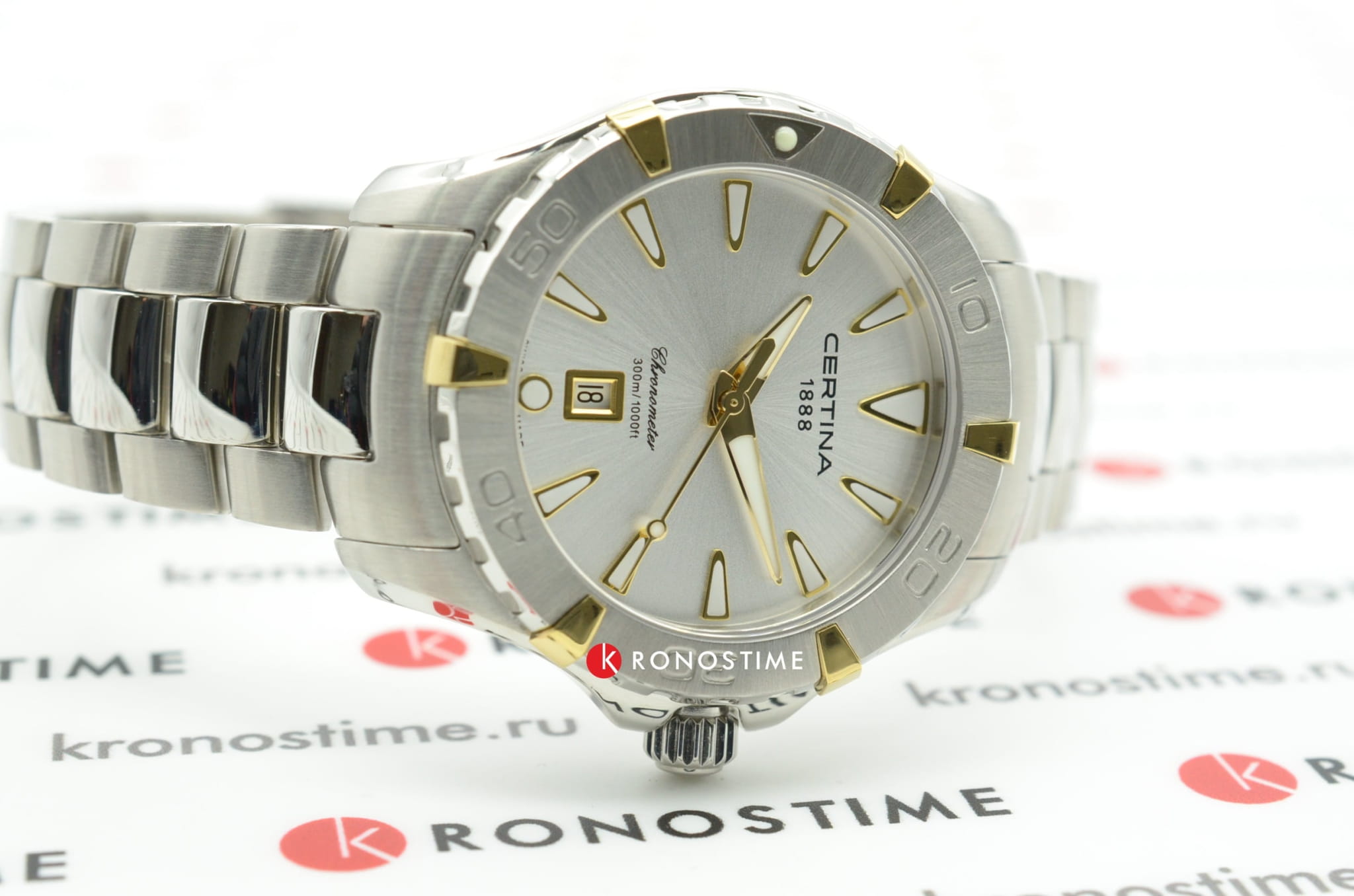 Компактный циферблат дополнен золотистыми элементами, показатели видны максимально чётко. Изящный аксессуар внутри просто «кремень», чему способствует система DS ConceptDS ConceptDouble Security Concept, обозначает двойную надёжность и безупречную точность часов Certina. Двойная система защиты подразумевает обеспечение максимальной устойчивости к ударам и высоких показателей водонепроницаемости.: водонепроницаемость 300 метров, завинчивающаяся задняя крышка и заводная головка с системой блокировки, сапфировое стекло, хирургическая сталь 316L. Швейцарский кварцевый механизм ETA F04.411 Precidrive™Precidrive™Инновационный кварцевый механизм Certina. Часы, оснащённые этим швейцарским калибром, приравниваются к точности к сертифицированным хронометрам, точность хода составляет +/-10 секунд в год. отмечен сертификатом хронометра COSCСертификат COSCОфициальный сертификат, подтверждающий то, что часы ходят с особо высокой точностью. Для получения документа часы подвергаются тестовым испытаниям, разработанным швейцарским институтом тестирования хронометров COSC. Допустимая норма для механических часов -4/+6 секунд в день, для кварцевых моделей +/- 0,07 секунд в день. за безупречную точность хода. Частичное PVD-покрытиеPVDУльтратонкое покрытие наносится в технике вакуумного напыления, сочетает в себе нитрид титана особой прочности со слоем золота или оксида хрома. Несёт в себе декоративную или защитную функцию.. Вращающийся безельБезельВнешний ободок, закрепляющий стекло. В спортивных часах так называется поворотное кольцо с делениями на циферблате, выполняет роль таймера – замеряет отрезки времени на шкале. Неподвижный безель – элемент декора. Однонаправленно вращающийся безель на дайверских часах позволяет фиксировать моменты погружения и выныривания на поверхность.. Яркая люминесцентная подсветкаЛюминесцентное покрытиеПозволяет считывать показания времени в темноте. Производители наносят на стрелки, часовые индексы, безель или поверхность циферблата светонакопительный состав, дающий холодное свечение.. Апертура даты, функция EOLEOLПредставляет собой систему, уведомляющую владельца часов о необходимости замены элемента питания. За 2 недели до полного разряда батарейки секундная стрелка перестаёт ходить чётко и начинает перепрыгивать на 3-4 деления.. Диаметр корпуса: 34 мм.