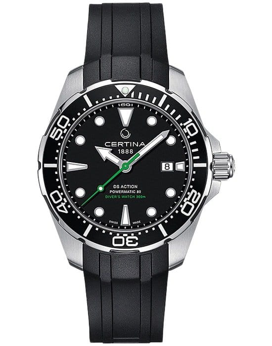 Брендовый аксессуар с чёрным циферблатом подходит для создания акцента для делового образа. Зелёная секундная стрелка и крупные метки обеспечивают превосходную читабельность показаний времени. Автоподзавод. Швейцарский механизм ETA Powermatic 80Powermatic 80Эксклюзивный калибр от швейцарской компании ETA с увеличенным запасом хода до 80 часов за счёт удлинённой заводной пружины. Характеризуется улучшенной системой спуска со сниженным трением. с 80-часовым запасом хода. Реализация системы DS ConceptDS ConceptDouble Security Concept, обозначает двойную надёжность и безупречную точность часов Certina. Двойная система защиты подразумевает обеспечение максимальной устойчивости к ударам и высоких показателей водонепроницаемости.. Сапфировое стекло. Вращающийся безельБезельВнешний ободок, закрепляющий стекло. В спортивных часах так называется поворотное кольцо с делениями на циферблате, выполняет роль таймера – замеряет отрезки времени на шкале. Неподвижный безель – элемент декора. Однонаправленно вращающийся безель на дайверских часах позволяет фиксировать моменты погружения и выныривания на поверхность. из лёгкого алюминия. Водонепроницаемость 300 метров. Люминесцентная подсветкаЛюминесцентное покрытиеПозволяет считывать показания времени в темноте. Производители наносят на стрелки, часовые индексы, безель или поверхность циферблата светонакопительный состав, дающий холодное свечение.. Корпус из нержавеющей стали 316L. Каучуковый ремешок. Застёжка с фиксатором и удлинением для дайверовУдлинение для дайверовЗастёжка с удлинением для дайверов представляет собой безопасное крепление, которое позволяет надевать часы поверх гидрокостюма. Гибкая застёжка удлиняется на 1-2 миллиметра.. Апертура даты. Диаметр корпуса: 43 мм.