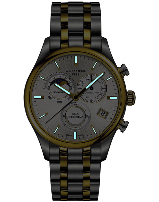 Швейцарские мужские часы Certina DS-8 Chronograph Moon Phase C033.450.22.031.00 из коллекции DS-8 привлекают оригинальным дизайном и абсолютной точностью хода. Модель, благодаря классической цветовой гамме и отсутствию броских деталей, станет универсальным аксессуаром к вашему образу. Брендовый хронографХронографФункция позволяет измерять отрезки времени с особой точностью: часы, минуты, секунды. Верным признаком хронографа является наличие на циферблате 3 дополнительных окошек-счётчиков. измеряет время с высокой точностью, что обеспечивает швейцарский кварцевый калибр ETA G10.962 Precidrive™Precidrive™Инновационный кварцевый механизм Certina. Часы, оснащённые этим швейцарским калибром, приравниваются к точности к сертифицированным хронометрам, точность хода составляет +/-10 секунд в год.. Браслет из нержавеющей стали. Сапфировое стекло с двухсторонним антибликовым покрытием. Корпус из нержавеющей стали 316L с PVD-покрытием.PVDУльтратонкое покрытие наносится в технике вакуумного напыления, сочетает в себе нитрид титана особой прочности со слоем золота или оксида хрома. Несёт в себе декоративную или защитную функцию.. Водостойкость 10 бар. Люминесцентная подсветкаЛюминесцентное покрытиеПозволяет считывать показания времени в темноте. Производители наносят на стрелки, часовые индексы, безель или поверхность циферблата светонакопительный состав, дающий холодное свечение.. Задняя крышка с гравировкой. Секундомер, дата, индикатор EOLEOLПредставляет собой систему, уведомляющую владельца часов о необходимости замены элемента питания. За 2 недели до полного разряда батарейки секундная стрелка перестаёт ходить чётко и начинает перепрыгивать на 3-4 деления., отображение лунных фаз. Диаметр корпуса: 42 мм. Производство и сборка: Швейцария.