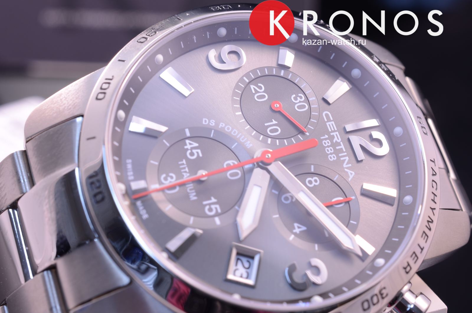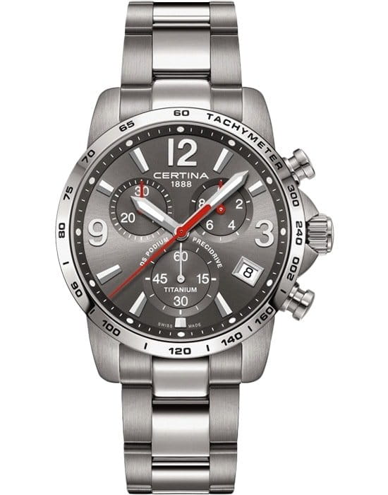 Брендовый хронографХронографФункция позволяет измерять отрезки времени с особой точностью: часы, минуты, секунды. Верным признаком хронографа является наличие на циферблате 3 дополнительных окошек-счётчиков. в серебристом исполнении дополнен красными элементами, придающими общему виду динамичность. Наручные часы отличаются повышенной устойчивостью к высоким нагрузкам благодаря реализации фирменной концепции Двойной Надёжности DS ConceptDS ConceptDouble Security Concept, обозначает двойную надёжность и безупречную точность часов Certina. Двойная система защиты подразумевает обеспечение максимальной устойчивости к ударам и высоких показателей водонепроницаемости., они выполнены из прочного титана. Швейцарский кварцевый механизм с высокой точностью хода ETA 251.264 AA Precidrive™Precidrive™Инновационный кварцевый механизм Certina. Часы, оснащённые этим швейцарским калибром, приравниваются к точности к сертифицированным хронометрам, точность хода составляет +/-10 секунд в год.. Повышенная водонепроницаемость WR 200. Завинчивающаяся заводная головка с защитой, закручивающаяся задняя крышка с гравировкой. Двухстороннее антибликовое покрытие сапфирового стекла. БезельБезельВнешний ободок, закрепляющий стекло. В спортивных часах так называется поворотное кольцо с делениями на циферблате, выполняет роль таймера – замеряет отрезки времени на шкале. Неподвижный безель – элемент декора. Однонаправленно вращающийся безель на дайверских часах позволяет фиксировать моменты погружения и выныривания на поверхность. со шкалой тахиметраТахиметрРазмеченная шкала, располагается на ободке или безеле часов. Тахиметр позволяет рассчитать скорость на определённом участке пути, расстояние измеряется в километрах или милях.. Яркая люминесцентная подсветкаЛюминесцентное покрытиеПозволяет считывать показания времени в темноте. Производители наносят на стрелки, часовые индексы, безель или поверхность циферблата светонакопительный состав, дающий холодное свечение.. Механизм индикации часовых поясов, отображение даты, измерение времени с точностью до 1/100 секунды. . Диаметр корпуса: 44 мм.