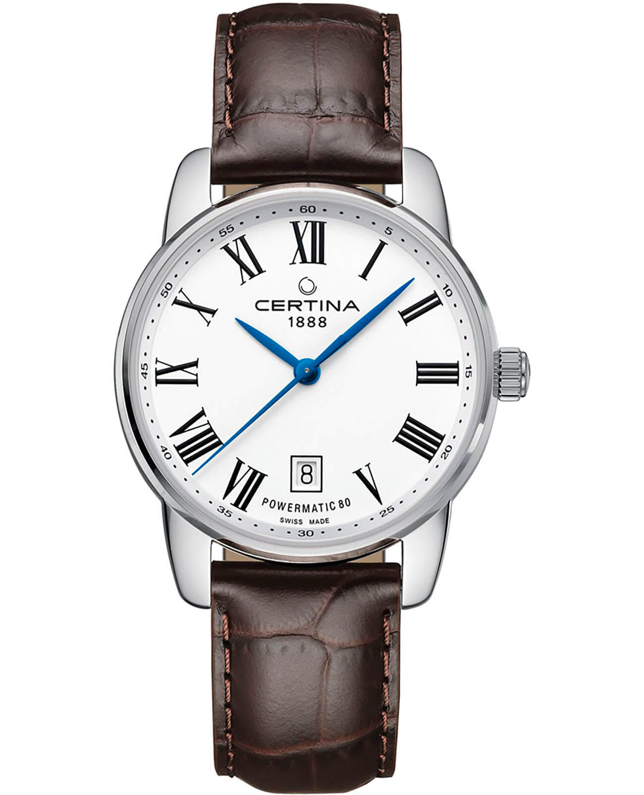 Элегантный стиль, широкий браслет, минималистичный циферблат, синие контрастные стрелки – модель выглядит ярко и в то же время строго. Это позволяет носить часы при любых обстоятельствах, Будь то повседневная прогулка или бизнес-встреча. Часы оснащены швейцарским автоматическим механизмом ETA Powermatic 80Powermatic 80Эксклюзивный калибр от швейцарской компании ETA с увеличенным запасом хода до 80 часов за счёт удлинённой заводной пружины. Характеризуется улучшенной системой спуска со сниженным трением. с увеличенным запасом хода до 80 часов. Циферблат дополнен сапфировым стеклом, антибликовое покрытие обеспечивает идеальную читаемость данных даже при ярком свете. Наручные часы отличаются ударопрочностью и водонепроницаемостью 100 метров благодаря фирменной концепции DS ConceptDS ConceptDouble Security Concept, обозначает двойную надёжность и безупречную точность часов Certina. Двойная система защиты подразумевает обеспечение максимальной устойчивости к ударам и высоких показателей водонепроницаемости.. Корпус сделан из стали 316L, материал долговечен и устойчив к коррозии. На метке 6 часов размещено окошко даты. Ремешок – из натуральной кожи. Диаметр корпуса: 39 мм.
