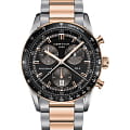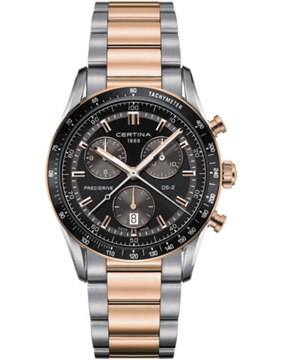 Стальной корпус оснащён алюминиевым безелемБезельВнешний ободок, закрепляющий стекло. В спортивных часах так называется поворотное кольцо с делениями на циферблате, выполняет роль таймера – замеряет отрезки времени на шкале. Неподвижный безель – элемент декора. Однонаправленно вращающийся безель на дайверских часах позволяет фиксировать моменты погружения и выныривания на поверхность., дополненным шкалой тахиметраТахиметрРазмеченная шкала, располагается на ободке или безеле часов. Тахиметр позволяет рассчитать скорость на определённом участке пути, расстояние измеряется в километрах или милях.. Швейцарский кварцевый калибр ETA 251.264 Precidrive™Precidrive™Инновационный кварцевый механизм Certina. Часы, оснащённые этим швейцарским калибром, приравниваются к точности к сертифицированным хронометрам, точность хода составляет +/-10 секунд в год., способствует работе секундомера, измеряющего время с точностью до 1/100 секунды. Функции: хронографХронографФункция позволяет измерять отрезки времени с особой точностью: часы, минуты, секунды. Верным признаком хронографа является наличие на циферблате 3 дополнительных окошек-счётчиков., дата, EOLEOLПредставляет собой систему, уведомляющую владельца часов о необходимости замены элемента питания. За 2 недели до полного разряда батарейки секундная стрелка перестаёт ходить чётко и начинает перепрыгивать на 3-4 деления..