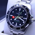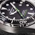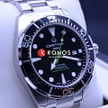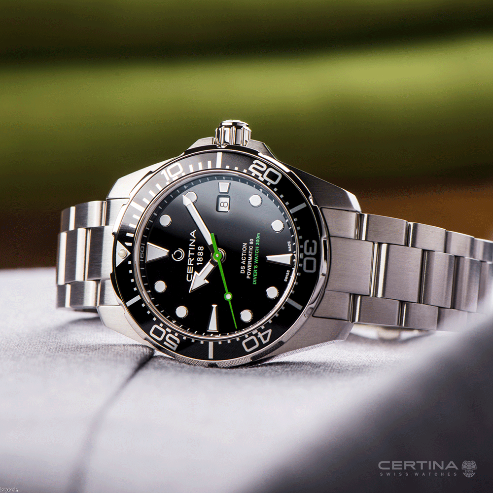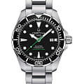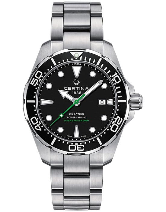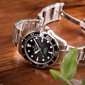 Стильный аксессуар воплощает собой дайверскую тематику, он способен сохранять водостойкость при давлении до 30 бар. Лаконично выглядит чёрный циферблат с зелёной секундной стрелкой в сочетании с серебристым блеском нержавеющей стали, из которой изготовлены ударопрочный корпусУдаропрочный корпусМеханизм заключён в корпус, выполненный из современных материалов, устойчивых к ударам, механическим повреждениям и падению с высоты: инновационный пластик, карбон, нержавеющая сталь, титан. и браслет. Наручные часы оснащены швейцарским механизмом ETA Powermatic 80Powermatic 80Эксклюзивный калибр от швейцарской компании ETA с увеличенным запасом хода до 80 часов за счёт удлинённой заводной пружины. Характеризуется улучшенной системой спуска со сниженным трением. с 80-часовым запасом хода. Завинчивающаяся заводная головка с системой защиты. Антибликовое покрытие сапфирового стекла. Люминесцентная подсветкаЛюминесцентное покрытиеПозволяет считывать показания времени в темноте. Производители наносят на стрелки, часовые индексы, безель или поверхность циферблата светонакопительный состав, дающий холодное свечение. стрелок и меток. Надёжная застежка с фиксатором и удлинением для дайверовУдлинение для дайверовЗастёжка с удлинением для дайверов представляет собой безопасное крепление, которое позволяет надевать часы поверх гидрокостюма. Гибкая застёжка удлиняется на 1-2 миллиметра.. Однонаправленно вращающийся алюминиевый безельБезельВнешний ободок, закрепляющий стекло. В спортивных часах так называется поворотное кольцо с делениями на циферблате, выполняет роль таймера – замеряет отрезки времени на шкале. Неподвижный безель – элемент декора. Однонаправленно вращающийся безель на дайверских часах позволяет фиксировать моменты погружения и выныривания на поверхность.. Диаметр корпуса: 43 мм.