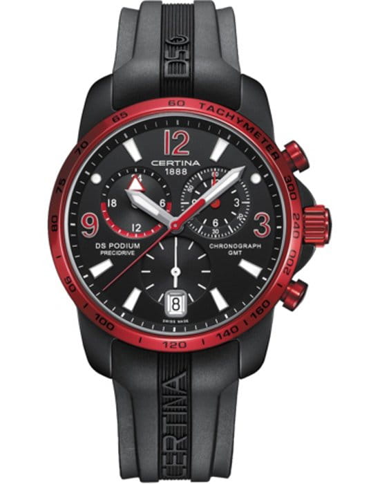 Модель обладает полезным функционалом: хронографХронографФункция позволяет измерять отрезки времени с особой точностью: часы, минуты, секунды. Верным признаком хронографа является наличие на циферблате 3 дополнительных окошек-счётчиков., секундомер, GMTGMTОтображение времени второго часового пояса.Такая функция особенно актуальна для путешественников и бизнесменов,которые общаются с людьми из разных стран,теперь вы всегда будете знать,какой час у вашего партнёра или близкого человека., календарь, тахиметрТахиметрРазмеченная шкала, располагается на ободке или безеле часов. Тахиметр позволяет рассчитать скорость на определённом участке пути, расстояние измеряется в километрах или милях.. Швейцарский кварцевый калибр G10.962 BF Precidrive™Precidrive™Инновационный кварцевый механизм Certina. Часы, оснащённые этим швейцарским калибром, приравниваются к точности к сертифицированным хронометрам, точность хода составляет +/-10 секунд в год.. Сверхлёгкий алюминиевый корпус красного цвета. Каучуковый ремешок. Сапфировое стекло.