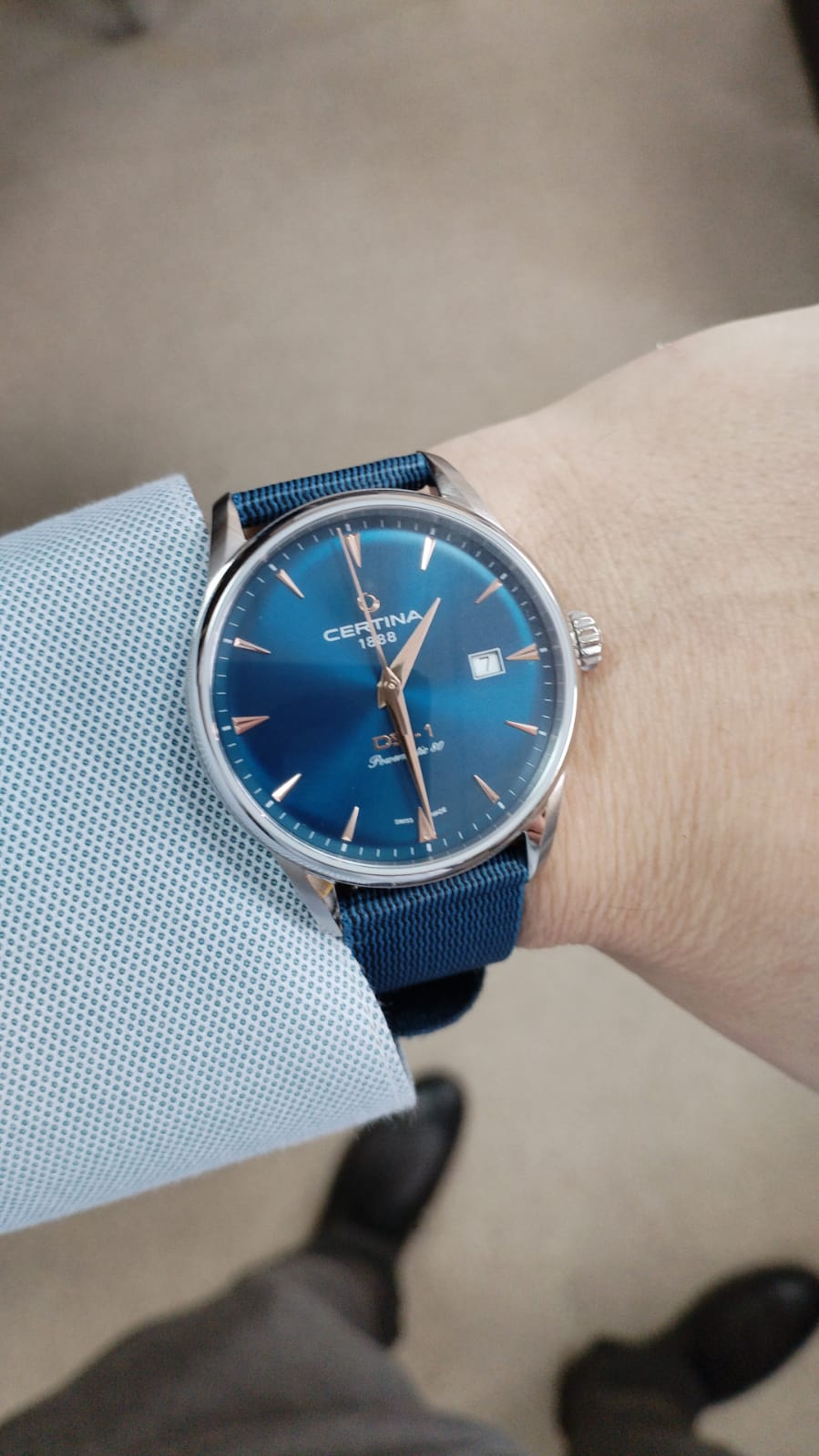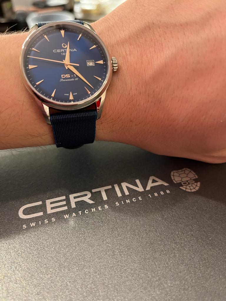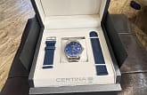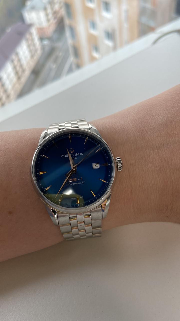 Аксессуар выполнен в классическом стиле, элегантно смотрится сатинированный синий циферблат. Надёжный стальной корпус дополнен уплотнительным кольцом в соответствии с концепцией Двойной Надёжности DSDS ConceptDouble Security Concept, обозначает двойную надёжность и безупречную точность часов Certina. Двойная система защиты подразумевает обеспечение максимальной устойчивости к ударам и высоких показателей водонепроницаемости.. Он защищает швейцарский автоматический механизм ETA Powermatic 80Powermatic 80Эксклюзивный калибр от швейцарской компании ETA с увеличенным запасом хода до 80 часов за счёт удлинённой заводной пружины. Характеризуется улучшенной системой спуска со сниженным трением. с увеличенным запасом хода до 80 часов. Калибр дополнен кремниевой спиралью Nivachron™, устраняющей действие магнитных полей. Выпуклое сапфировое стекло имеет покрытие антиблик. Часы водонепроницаемы до 100 метров. Браслет оснащён системой быстрой замены. В нижней части циферблата размещена крупная апертура даты. Диаметр корпуса: 40 мм.