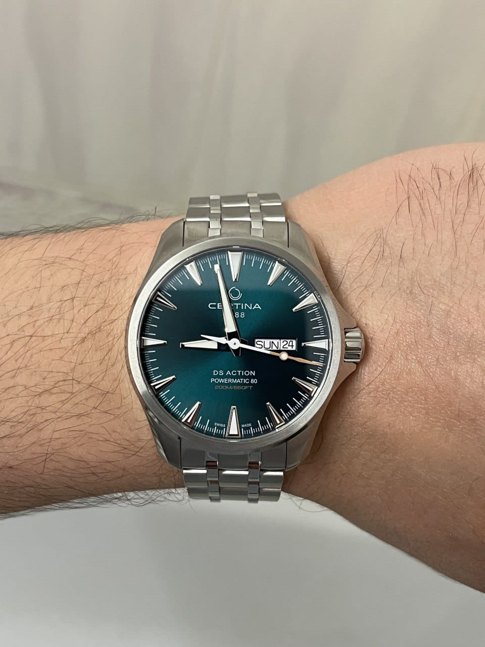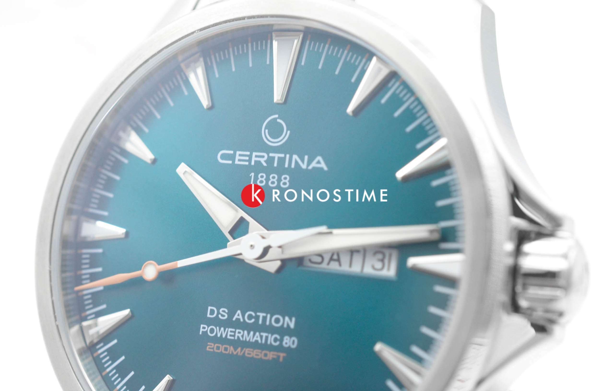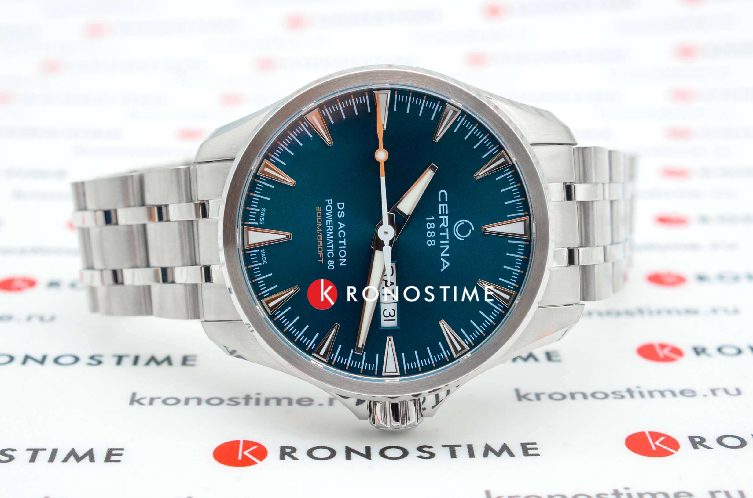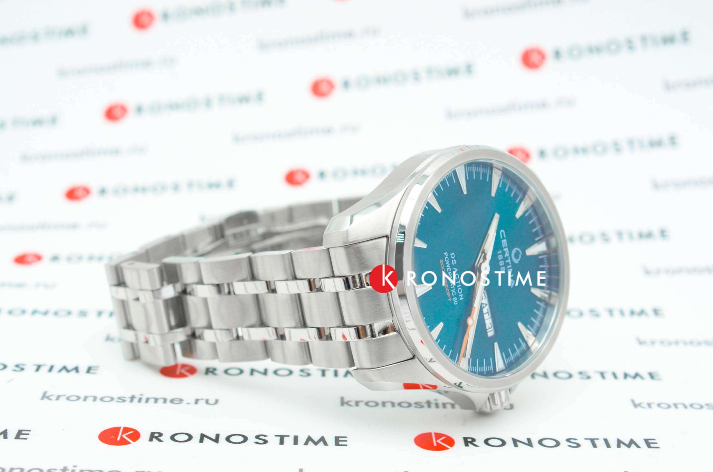 Брендовая модель имеет изумрудный циферблат с контрастными стрелками и часовой разметкой, что обеспечивает хорошую читаемость показателей в любых условиях. Стальной браслет надёжно обхватывает запястье, а предотвращает случайное расстёгивание. Часы работают за счёт швейцарского пружинного механизма ETA Powermatic 80Powermatic 80Эксклюзивный калибр от швейцарской компании ETA с увеличенным запасом хода до 80 часов за счёт удлинённой заводной пружины. Характеризуется улучшенной системой спуска со сниженным трением., его запас хода увеличен до 80 часов. Соблюдение DS ConceptDS ConceptDouble Security Concept, обозначает двойную надёжность и безупречную точность часов Certina. Двойная система защиты подразумевает обеспечение максимальной устойчивости к ударам и высоких показателей водонепроницаемости.. Корпус из нержавеющей стали 316L. Стекло из сапфира с покрытием «антиблик». Водостойкость 200 метров. Подсветка SuperLumiNovaЛюминесцентное покрытиеПозволяет считывать показания времени в темноте. Производители наносят на стрелки, часовые индексы, безель или поверхность циферблата светонакопительный состав, дающий холодное свечение.. Завинчивающаяся задняя крышка. Защищённая заводная головка. Календарь с индикацией числа и дня недели. Диаметр корпуса: 41 мм.