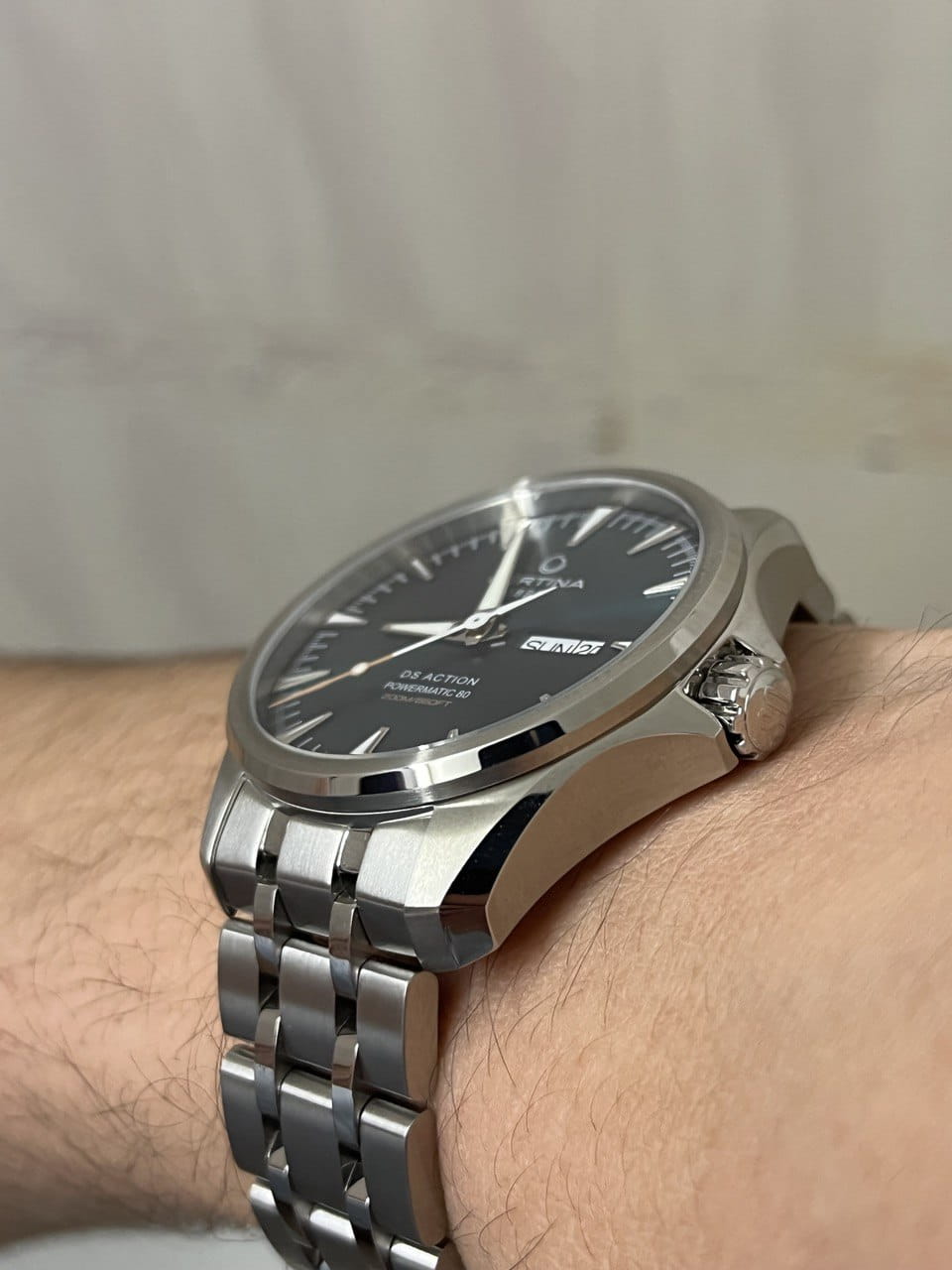 Запас хода до 80 часов, водозащита до 200м., завинчивающаяся заводная головка. Браслет здесь красивый и отличного качества.