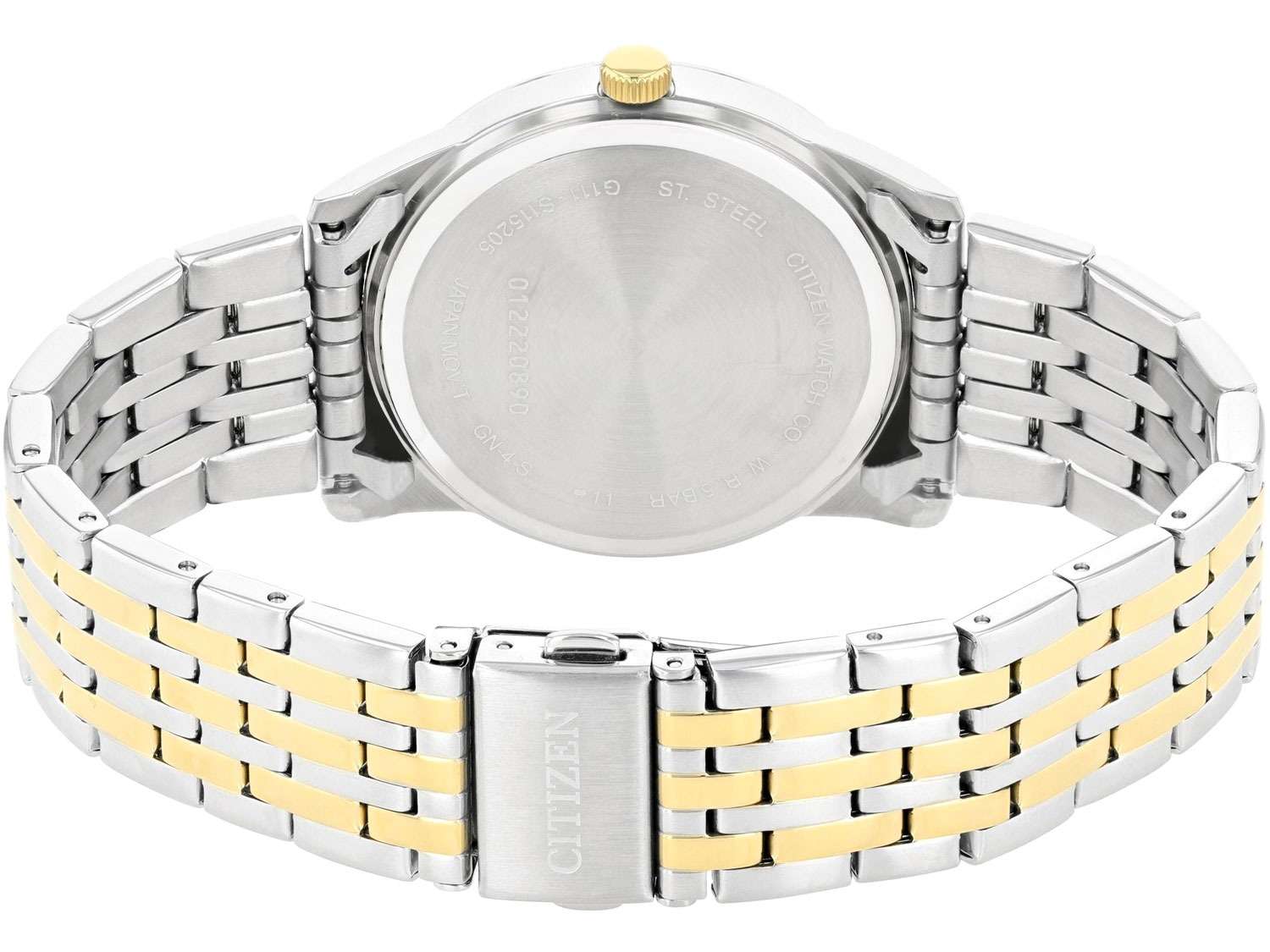 Часы Citizen BI5006-81P сочетают в себе японское качество, современный дизайн и надежность кварцевого механизма Citizen G111. Круглый корпус диаметром 39 мм выполнен из прочной нержавеющей стали, что обеспечивает долговечность и стильный внешний вид. Белый циферблат украшен метками в виде штрихов, а также дополнен окошком календаря с отображением даты и дня недели в позиции «3 часа». Стрелки с люминесцентным покрытиемЛюминесцентное покрытиеПозволяет считывать показания времени в темноте. Производители наносят на стрелки, часовые индексы, безель или поверхность циферблата светонакопительный состав, дающий холодное свечение., что обеспечивает отличную видимость в темноте. Минеральное стеклоМинеральное стеклоМинеральное стекло представляет собой искусственно выращенный минерал кварца. Такое стекло отличается особой устойчивостью к повреждениям и царапинам. Уступает по некоторым качествам сапфировому стеклу. защищает циферблат от царапин и повреждений. Рифленая заводная головка подчеркивает элегантность и практичность модели. Стальной браслет с частичным золотистым IP-покрытиемIP-покрытиеМетод ионного напыления. Демонстрирует повышенную устойчивость к истиранию, окислению и химическим веществам. Под воздействием высокого давления и температуры около 1500°C молекулы металла надёжно соединяются с частицами корпуса часов. оснащен надежной раскладной застёжкойРаскладная застёжкаТакой тип застёжки используется только на браслетах из металла. Она никогда не раскрывается полностью, происходит разделение на 2 и более частей. Раскладывающая застёжка снизит вероятность потери часов к минимуму., что обеспечивает комфортное ношение и подходит для любого случая. Водозащита до 50 метров позволяет не бояться случайных брызг и дождя.