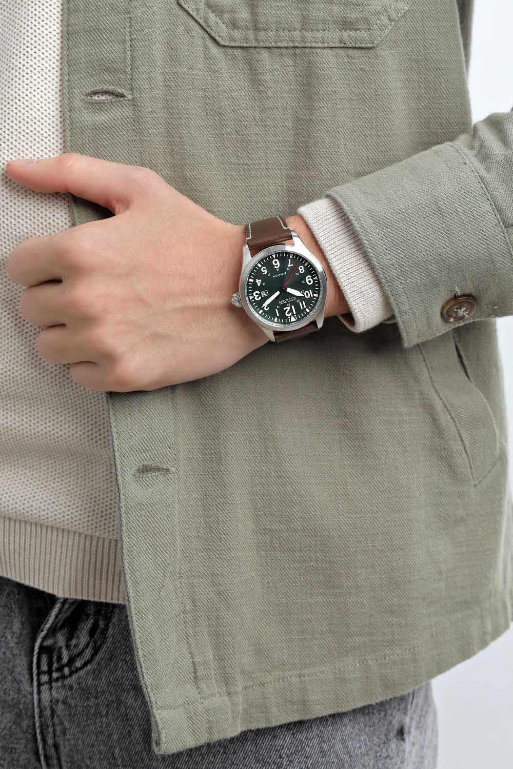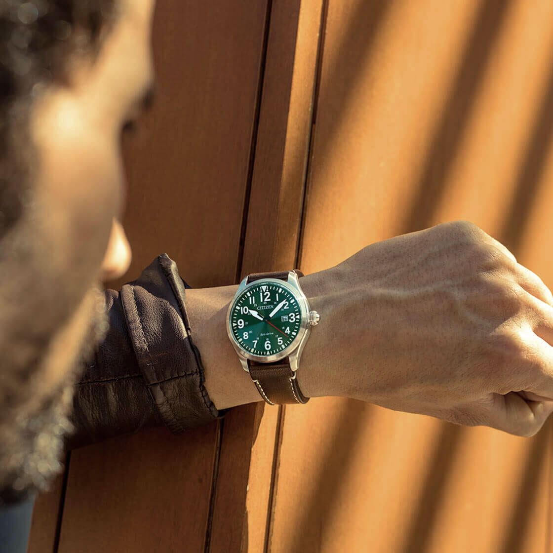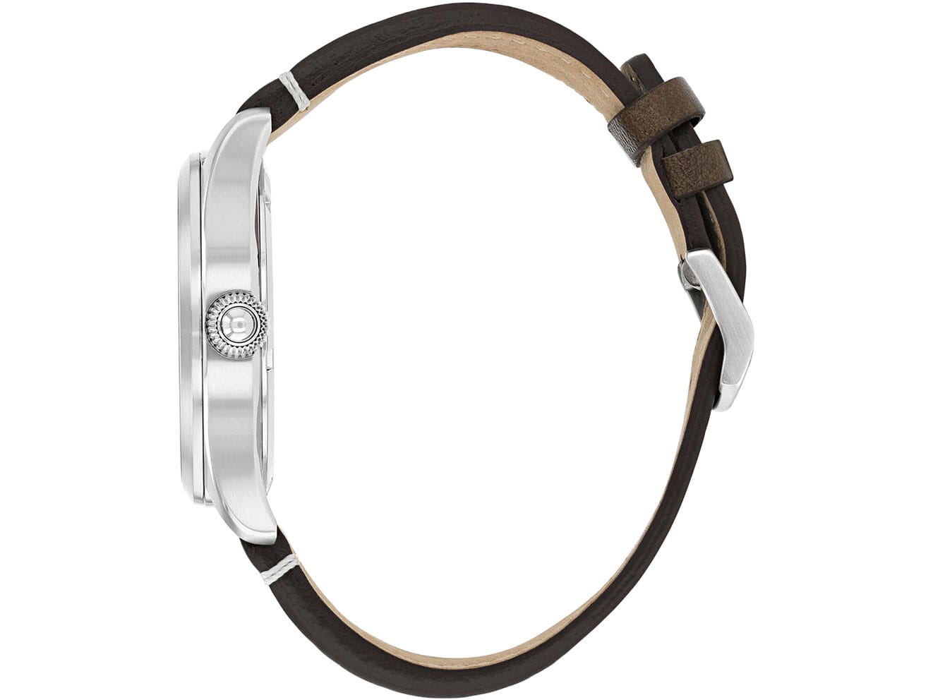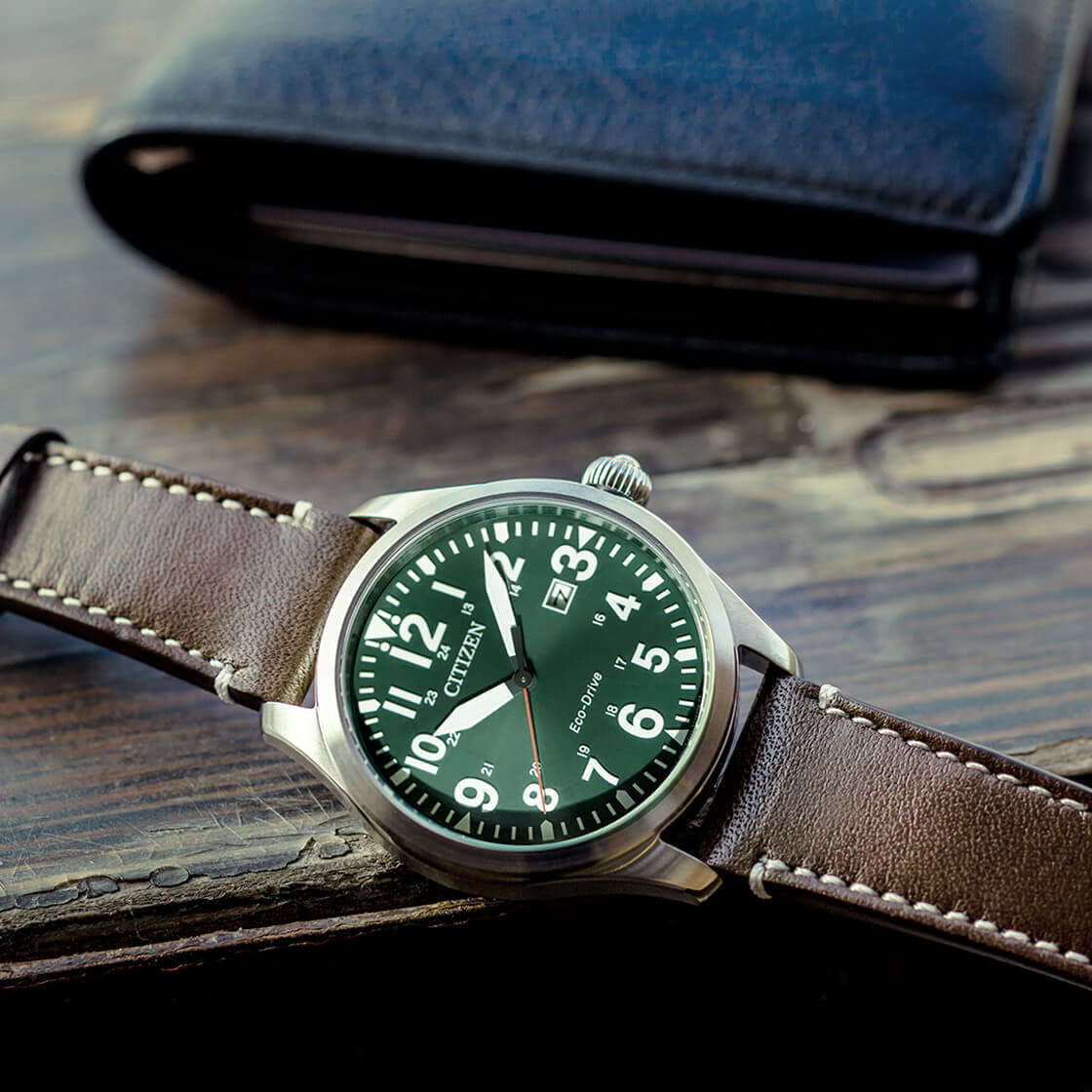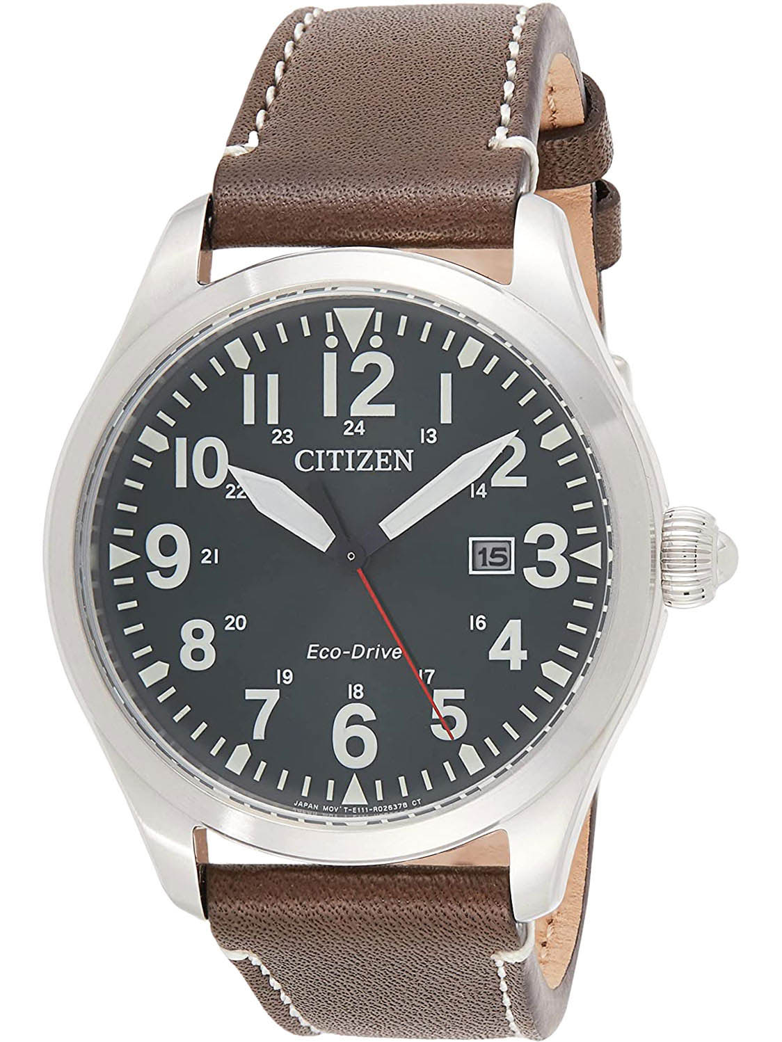 Мужские кварцевые часы с минеральным стекломМинеральное стеклоМинеральное стекло представляет собой искусственно выращенный минерал кварца. Такое стекло отличается особой устойчивостью к повреждениям и царапинам. Уступает по некоторым качествам сапфировому стеклу. Citizen Eco-Drive BM6838-25X. Корпус часов изготовлен из стали. Класс водозащиты: 100 метров, позволит плавать, нырять и заниматься другими водными видами спорта. Стрелки и метки с люминесцентным покрытиемЛюминесцентное покрытиеПозволяет считывать показания времени в темноте. Производители наносят на стрелки, часовые индексы, безель или поверхность циферблата светонакопительный состав, дающий холодное свечение.. Кожаный ремешок.