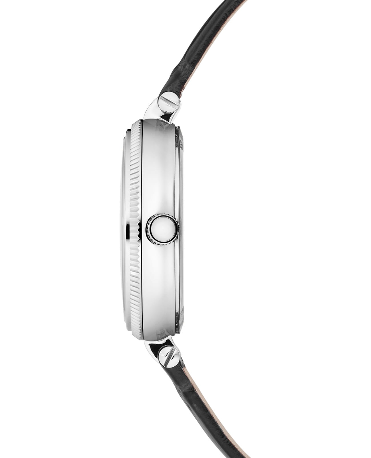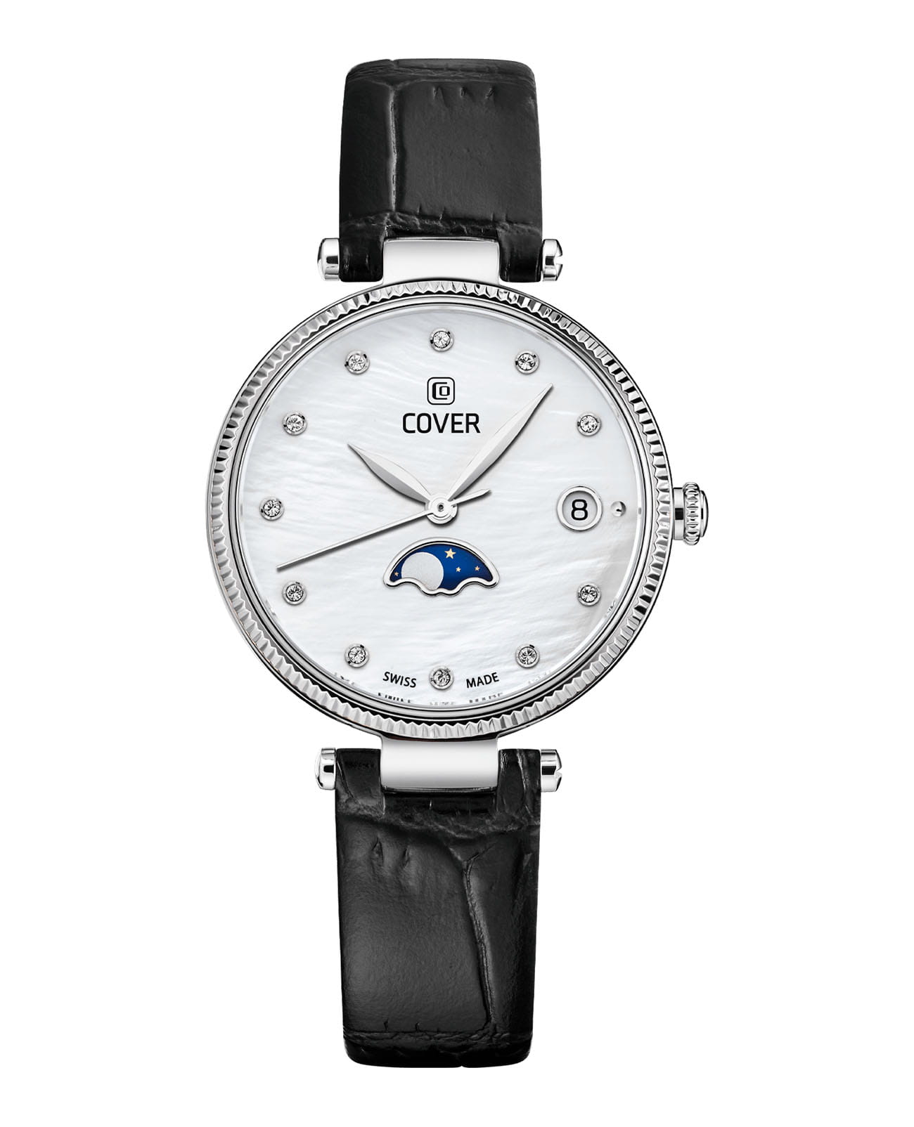 Женские наручные часы Cover CO196.04 из коллекции Fly Me To The Moon сочетают в себе элегантность и точность швейцарского производства. Модель обладает круглым корпусом диаметром 32 мм, изготовленным из нержавеющей стали с полированным покрытием. Браслет выполнен из черной кожаной ремешка, оснащенный классической застежкой для комфортного ношения. Белый перламутровый циферблат украшен 11 кристаллами, которые выполняют роль индексов часов, а также имеет окно фаз Луны на «6 часах» и апертуру даты на «3 часах». Для защиты используется стекло с антибликовым покрытиемАнтибликовое покрытиеСлой оксида металла в 0,13-0,3 микрон, благодаря которому стекло часов не бликует и не отражает свет. Антибликовое покрытие уменьшает отражение света в 10 раз, обеспечивая отличную читаемость показателей циферблата., обеспечивающее превосходную читаемость времени при любых условиях освещения. Часы работают на высокоточном кварцевом механизме, гарантирующем исключительную точность хода без необходимости подзаводки. Водонепроницаемость часов достигает 5 атмосфер (WR 50), что позволяет использовать их в повседневной жизни, однако не рекомендуется для контакта с водой во время плавания или дайвинга. Эти швейцарские часы станут идеальным дополнением как классического, так и повседневного образа женщины, ценящей элегантность и качество.