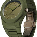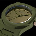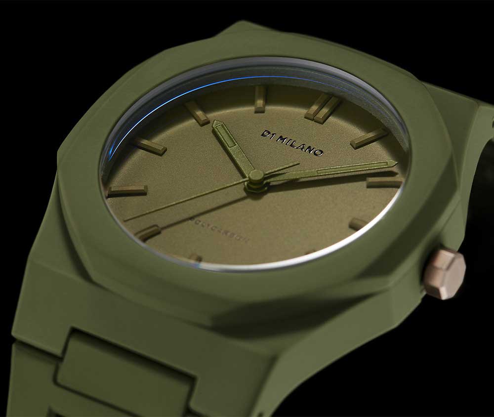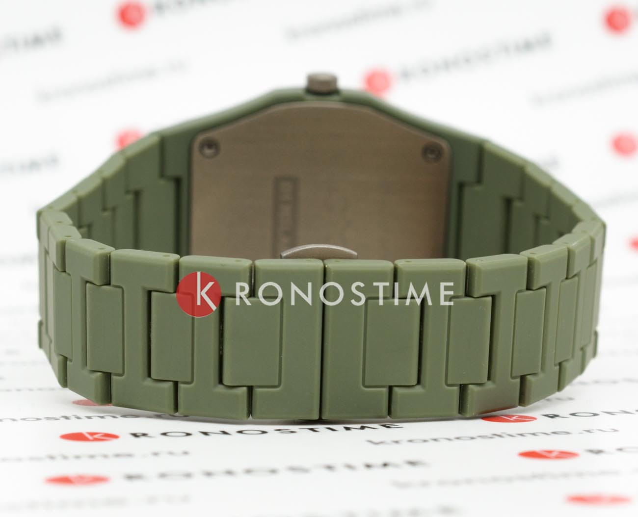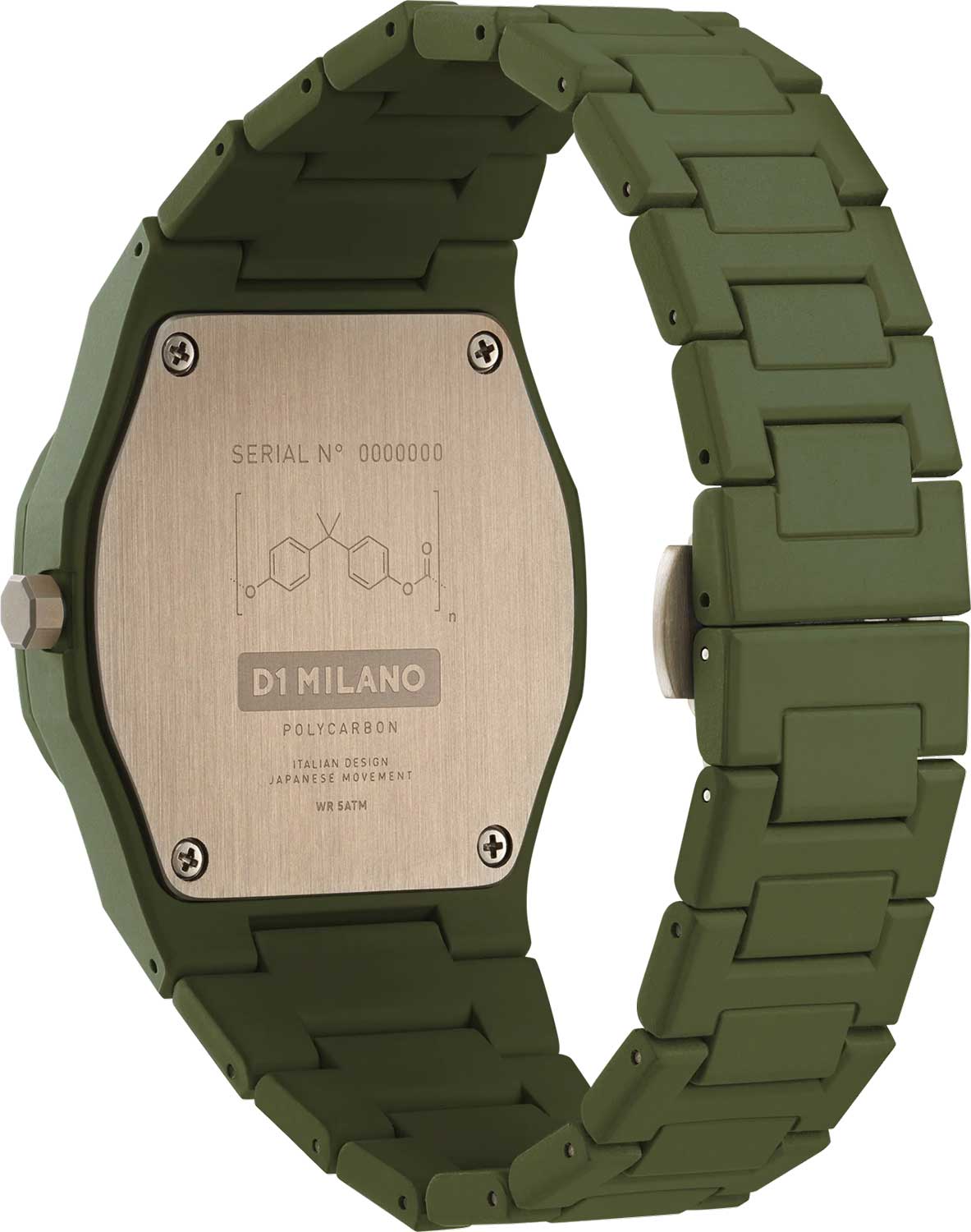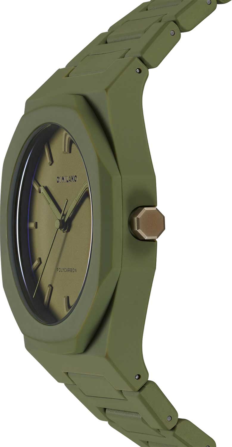Часы D1 Milano Polycarbon PCBJ22 – молодежные часы в стиле унисекс для повседневных образов. Модель Military Green имеет зеленый корпус из поликарбоната с покрытием Софт-Тач. Циферблат лаконичный с индексами в виде штрихов, защищен минеральным стекломМинеральное стеклоМинеральное стекло представляет собой искусственно выращенный минерал кварца. Такое стекло отличается особой устойчивостью к повреждениям и царапинам. Уступает по некоторым качествам сапфировому стеклу. с антибликовым покрытием. Стальная задняя крышка на 4 винтах. Пластиковый браслет с раскладной застёжкойРаскладная застёжкаТакой тип застёжки используется только на браслетах из металла. Она никогда не раскрывается полностью, происходит разделение на 2 и более частей. Раскладывающая застёжка снизит вероятность потери часов к минимуму..