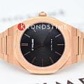 Женские наручные часы D1 Milano UTBL06 из коллекции Ultra Thin сочетают в себе элегантный дизайн и современные технологии. Модель обладает круглым корпусом диаметром 34 мм, изготовленным из нержавеющей стали с PVD-покрытиемPVDУльтратонкое покрытие наносится в технике вакуумного напыления, сочетает в себе нитрид титана особой прочности со слоем золота или оксида хрома. Несёт в себе декоративную или защитную функцию. в розовом золоте, что обеспечивает устойчивость к внешним воздействиям. Толщина ультратонкого корпуса составляет всего 6 мм, делая аксессуар легким и удобным для повседневного использования. Браслет также выполнен из того же материала с раскладной застежкойРаскладной замокДанный вариант застежки используется только на часах с металлическим браслетом. Отличительная особенность такого крепления в том, что длина браслета становится универсальной и вы можете самостоятельно отрегулировать нужный вам размер – застежка просто двигается по браслету часов., гарантирующей комфортное ношение и безопасность. Черный циферблат украшен метками в виде штрихов и оснащен стрелочным механизмом в тон корпуса, который подчеркивает элегантность модели. Для защиты используется сапфировое стеклоСапфировое стеклоПрочный и надёжный материал из кристалла сапфира синтетического происхождения, характеризующийся особой твёрдостью и устойчивостью к царапинам и повреждениям., обеспечивающее прочную защиту от царапин и бликов. Часы работают на кварцевом механизме, гарантирующем точность хода без необходимости регулярного подзавода. Водонепроницаемость часов достигает 5 атмосфер (50 метров), что позволяет использовать их во время мытья рук или плавания, однако не рекомендуется для глубоководного дайвинга.