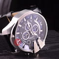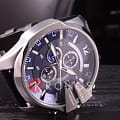 Массивный циферблат дополнен контрастными метками и стрелками с люминесцентным покрытиемЛюминесцентное покрытиеПозволяет считывать показания времени в темноте. Производители наносят на стрелки, часовые индексы, безель или поверхность циферблата светонакопительный состав, дающий холодное свечение.. Оригинально оформлена апертура даты. Спортивный хронографХронографФункция позволяет измерять отрезки времени с особой точностью: часы, минуты, секунды. Верным признаком хронографа является наличие на циферблате 3 дополнительных окошек-счётчиков. оснащён кварцевым механизмом с высокой точностью хода, он защищён корпусом из антикоррозионной стали 316L. Минеральное стекло устойчиво к появлению царапин. Ремешок – из натуральной кожи.