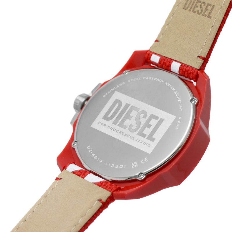 Мужские американские часы с минеральным стекломМинеральное стеклоМинеральное стекло представляет собой искусственно выращенный минерал кварца. Такое стекло отличается особой устойчивостью к повреждениям и царапинам. Уступает по некоторым качествам сапфировому стеклу. Diesel Baby Chief DZ4619, кварцевый механизм с высокой точностью. Класс водозащиты: 50 метров, позволит защитить корпус от случайных брызг или капель дождя. Корпус часов изготовлен из стали и пластика. Тканевый ремешок на стандартной застёжке. Стрелки и метки с люминесцентным покрытиемЛюминесцентное покрытиеПозволяет считывать показания времени в темноте. Производители наносят на стрелки, часовые индексы, безель или поверхность циферблата светонакопительный состав, дающий холодное свечение..
