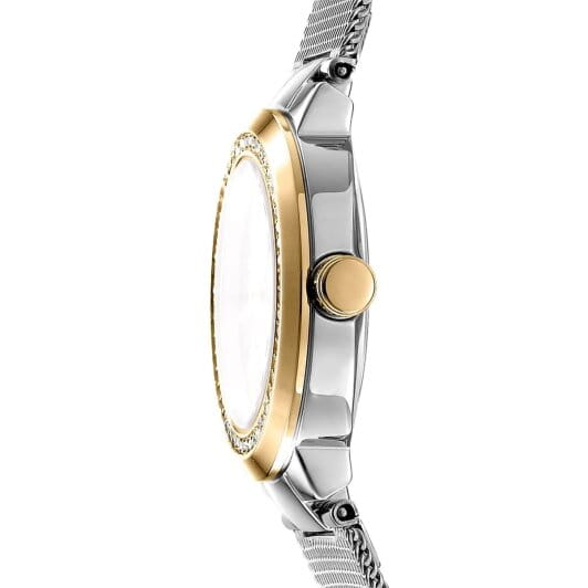Изящные женские наручные часы DKNY Eastside Mini DK1L024M0045 гармонично объединяют стиль и практичность. Корпус из нержавеющей стали диаметром 28 мм и минеральное стеклоМинеральное стеклоМинеральное стекло представляет собой искусственно выращенный минерал кварца. Такое стекло отличается особой устойчивостью к повреждениям и царапинам. Уступает по некоторым качествам сапфировому стеклу. обеспечивает защиту от царапин, а водонепроницаемость до 50 метров делает модель практичной для активного отдыха или повседневной носки. Браслет из нержавеющей стали на раскладной застёжкеРаскладная застёжкаТакой тип застёжки используется только на браслетах из металла. Она никогда не раскрывается полностью, происходит разделение на 2 и более частей. Раскладывающая застёжка снизит вероятность потери часов к минимуму. надежно фиксирует часы на руке и подчёркивает женственность дизайна. БезельБезельВнешний ободок, закрепляющий стекло. В спортивных часах так называется поворотное кольцо с делениями на циферблате, выполняет роль таймера – замеряет отрезки времени на шкале. Неподвижный безель – элемент декора. Однонаправленно вращающийся безель на дайверских часах позволяет фиксировать моменты погружения и выныривания на поверхность. инкрустирован кристаллами и IP-покрытиемIP-покрытиеМетод ионного напыления. Демонстрирует повышенную устойчивость к истиранию, окислению и химическим веществам. Под воздействием высокого давления и температуры около 1500°C молекулы металла надёжно соединяются с частицами корпуса часов.. Эта модель станет идеальным дополнением вашего гардероба, подчеркнув индивидуальный стиль.
