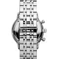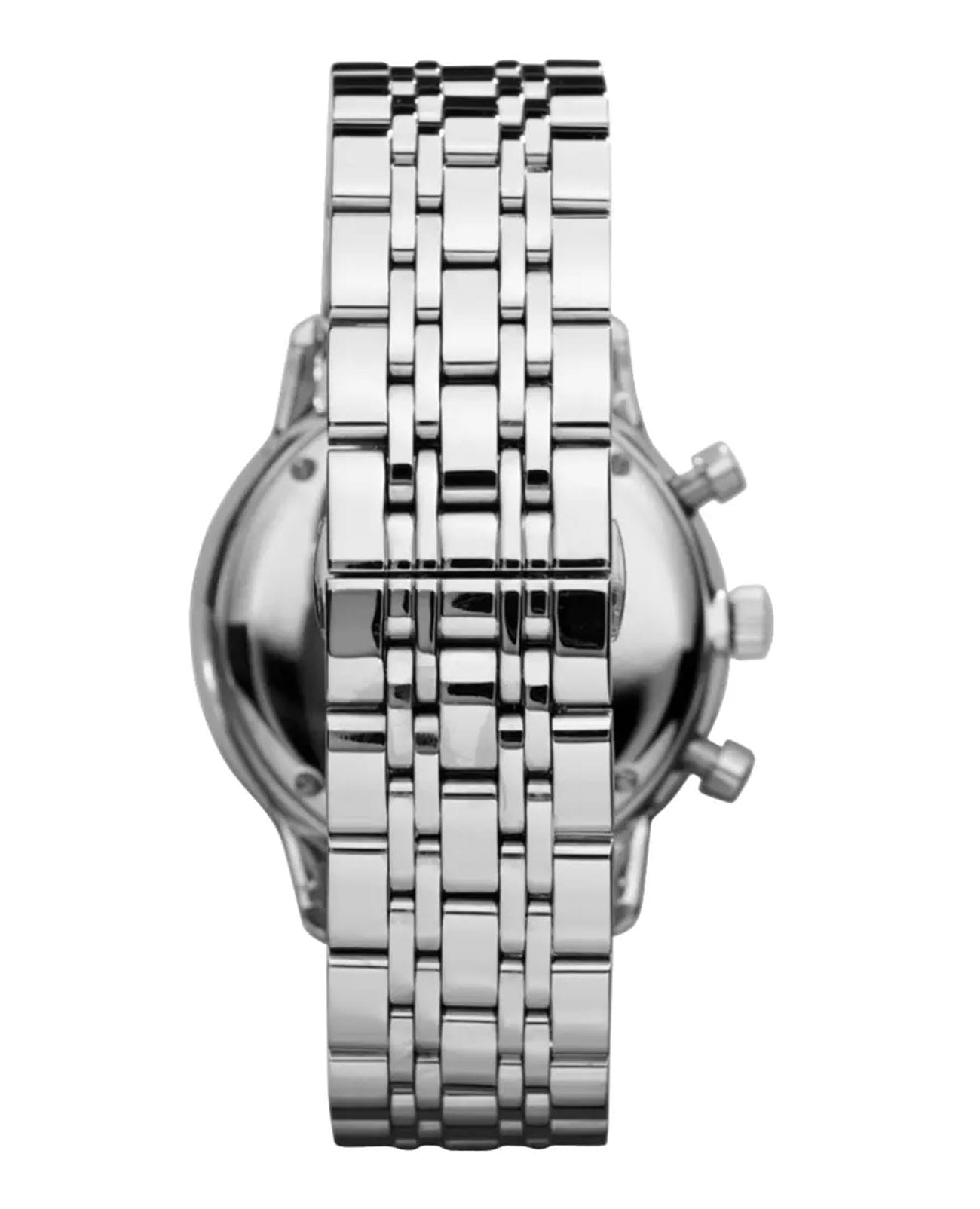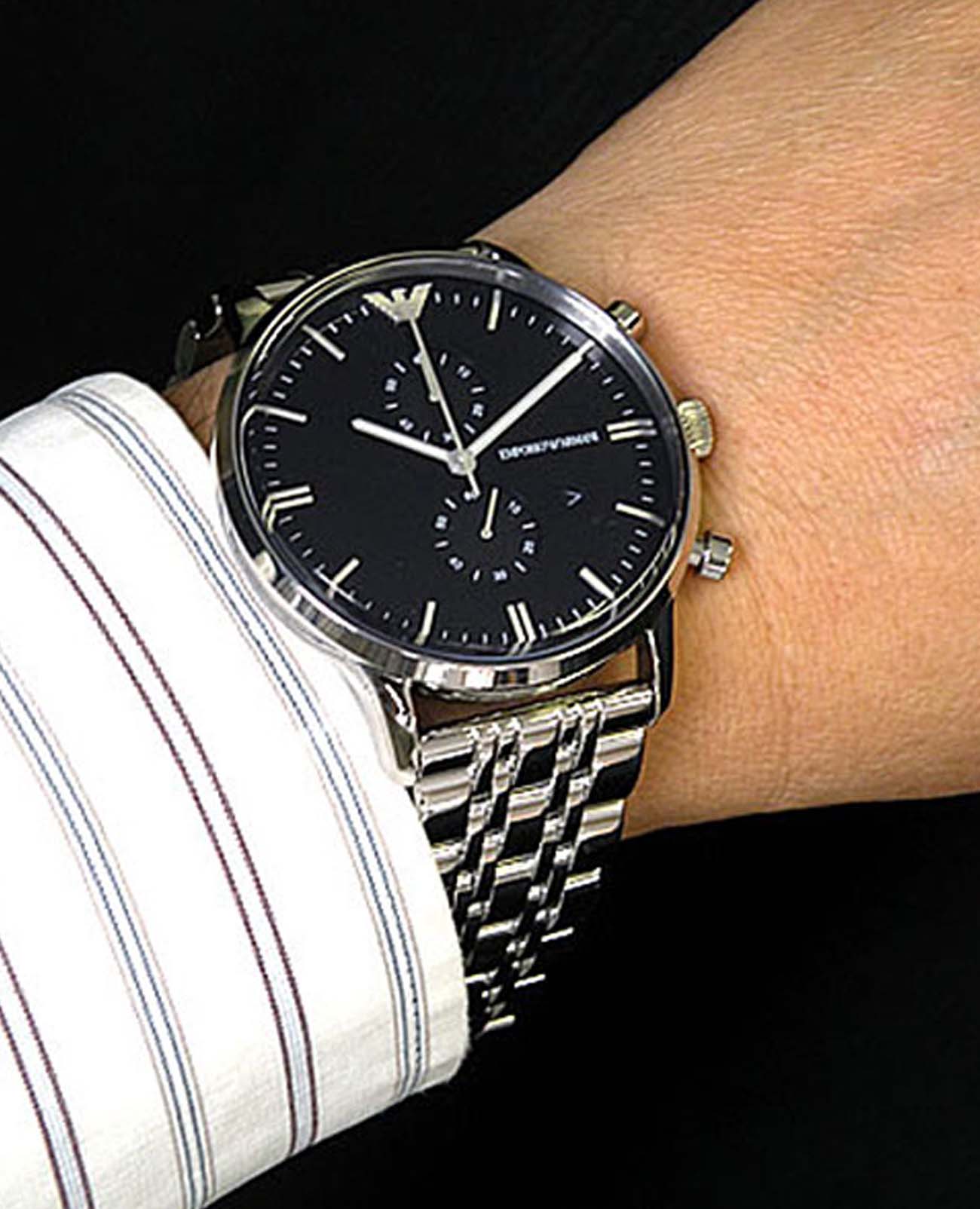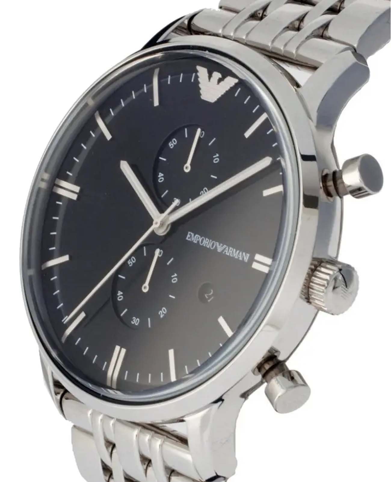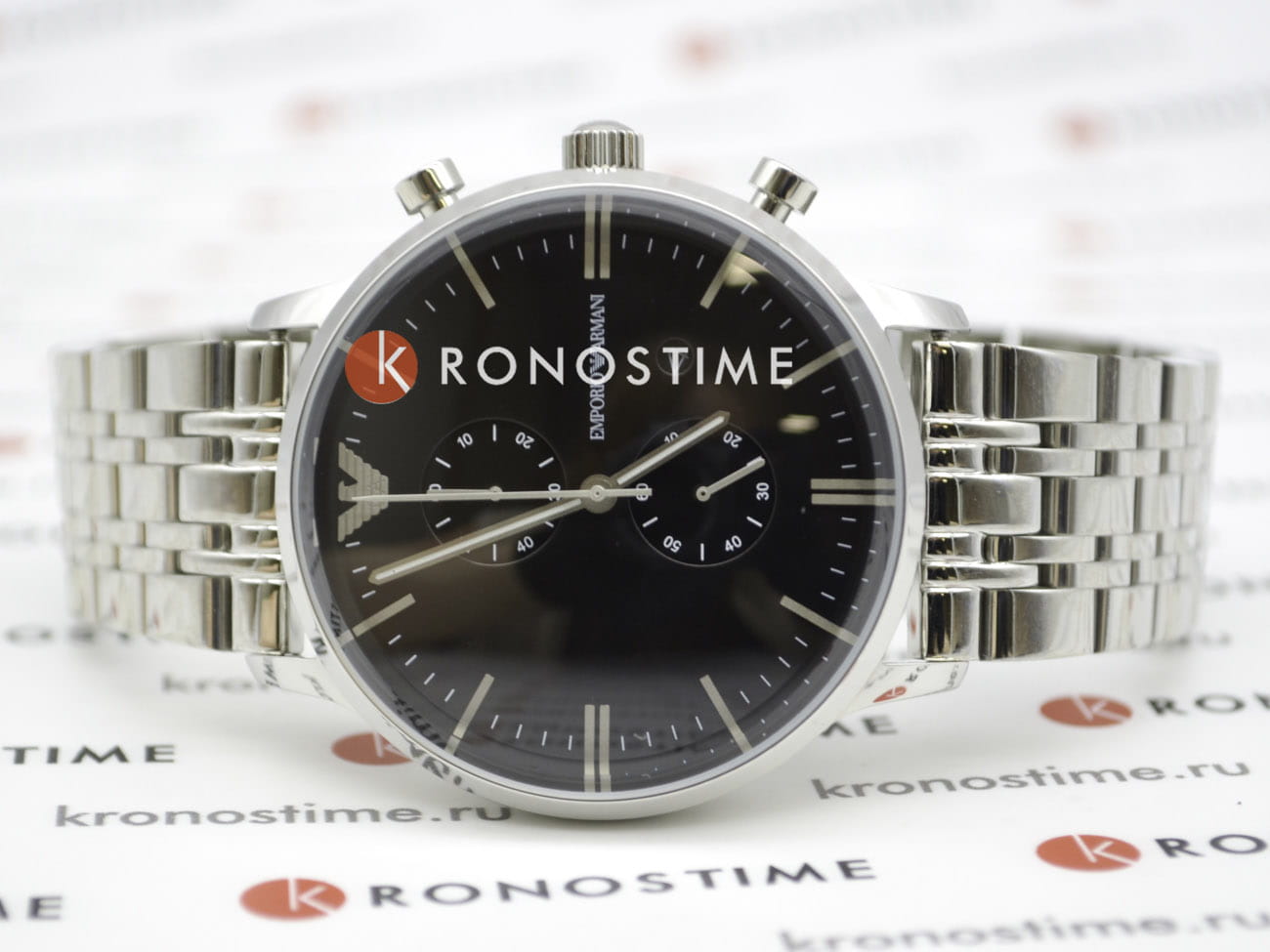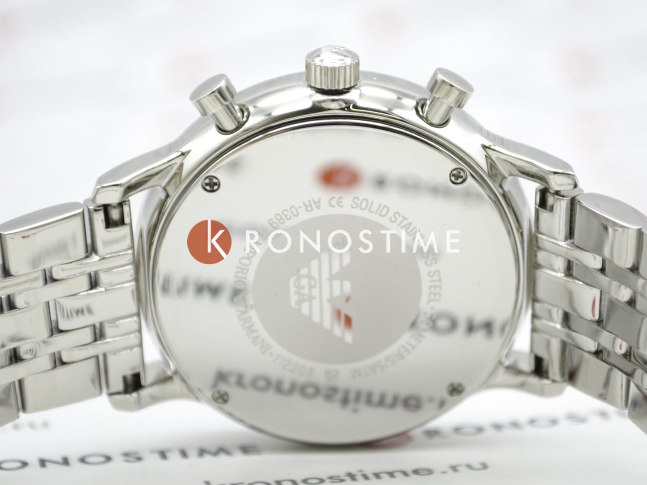 Мужские наручные часы-хронографХронографФункция позволяет измерять отрезки времени с особой точностью: часы, минуты, секунды. Верным признаком хронографа является наличие на циферблате 3 дополнительных окошек-счётчиков. с секундомеромСекундомерСекундоме́р — прибор, способный измерять интервалы времени с точностью до долей секунды. и минеральным стекломМинеральное стеклоМинеральное стекло представляет собой искусственно выращенный минерал кварца. Такое стекло отличается особой устойчивостью к повреждениям и царапинам. Уступает по некоторым качествам сапфировому стеклу. Emporio Armani  Classics AR0389, кварцевый механизм с высокой точностью. Корпус часов изготовлен из стали. Окошко даты находится в положении 4 часа. Стрелки и метки с люминесцентным покрытиемЛюминесцентное покрытиеПозволяет считывать показания времени в темноте. Производители наносят на стрелки, часовые индексы, безель или поверхность циферблата светонакопительный состав, дающий холодное свечение.. Класс водозащиты: 50 метров, позволит защитить корпус от случайных брызг или капель дождя. Стальной браслет на застёжке-бабочке с кнопкамиЗастёжка "бабочка"Такой вид застёжки дополняется предохранителями, помогающими избежать случайного раскрытия браслета. Обладают изящным исполнением. .