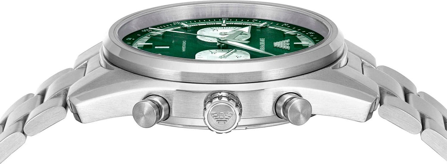Мужские часы Emporio Armani Racer AR11637 - стильные кварцевые часы-хронографХронографФункция позволяет измерять отрезки времени с особой точностью: часы, минуты, секунды. Верным признаком хронографа является наличие на циферблате 3 дополнительных окошек-счётчиков. с секундомеромСекундомерСекундоме́р — прибор, способный измерять интервалы времени с точностью до долей секунды. сочетают в себе элегантность и функциональность, что делает их идеальным аксессуаром для современного мужчины. Корпус часов из нержавеющей стали, что обеспечивает долговечность и устойчивость к внешним воздействиям. Минеральное стеклоМинеральное стеклоМинеральное стекло представляет собой искусственно выращенный минерал кварца. Такое стекло отличается особой устойчивостью к повреждениям и царапинам. Уступает по некоторым качествам сапфировому стеклу. защищает циферблат, добавляя изысканности всей конструкции. Размер корпуса составляет 42 мм, а толщина — 11 мм, что придаёт часам солидный внешний вид, не утяжеляя при этом запястье. Часы имеют водонепроницаемость WR50 (5 атм), это позволяет использовать их в повседневной жизни, не опасаясь воздействия воды. Стальной браслет на застёжке-бабочке с кнопкамиЗастёжка "бабочка"Такой вид застёжки дополняется предохранителями, помогающими избежать случайного раскрытия браслета. Обладают изящным исполнением. обеспечивает комфортное и надёжное крепление на запястье. 12-ти и 24-х часовой формат времени добавляет практичности и удобства в использовании. ТахиметрТахиметрРазмеченная шкала, располагается на ободке или безеле часов. Тахиметр позволяет рассчитать скорость на определённом участке пути, расстояние измеряется в километрах или милях. по внешнему краю. Окошко даты находится в положении 6 часов. Стрелки с люминесцентным покрытиемЛюминесцентное покрытиеПозволяет считывать показания времени в темноте. Производители наносят на стрелки, часовые индексы, безель или поверхность циферблата светонакопительный состав, дающий холодное свечение. обеспечивают удобное считывание времени в темноте после кратковременного пребывания на свету, что делает эти часы практичными в любых условиях.