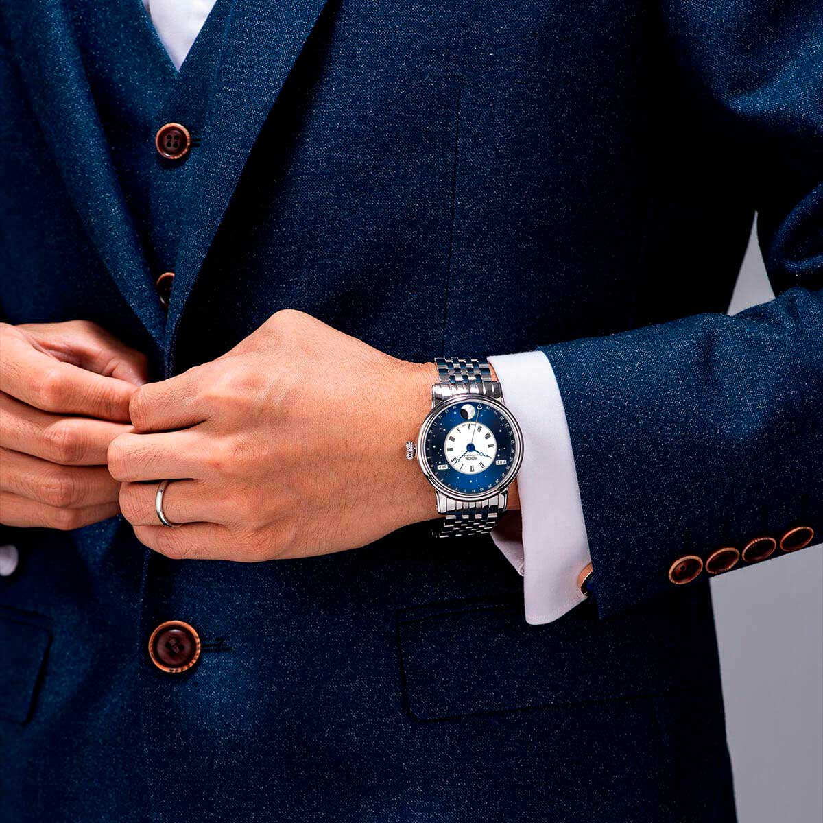 Мужские швейцарские механические часы с автоподзаводом Epos Oeuvre d'art 3439.322.20.26.30. Сапфировое стеклоСапфировое стеклоПрочный и надёжный материал из кристалла сапфира синтетического происхождения, характеризующийся особой твёрдостью и устойчивостью к царапинам и повреждениям. устойчивое к появлению царапин, обладающее высокой прозрачностью. Корпус часов изготовлен из нержавеющей стали. В механизме 25 камней, частота 28800 полуколебаний в час. Запас хода 42 часа. Механизм декорирован узором Cotes de Geneve. Циферблат в виде симбиоза белой лакированной вставки с римскими цифрами и вставки в виде ночного неба, выполненной по технологии Sunray (солнечные лучи). Светящиеся звезды и большая луна с люминесцентной подсветкойЛюминесцентное покрытиеПозволяет считывать показания времени в темноте. Производители наносят на стрелки, часовые индексы, безель или поверхность циферблата светонакопительный состав, дающий холодное свечение.. Дата отображается центральной стрелкой. Окошко дня недели и месяца. Автоматический указатель фазы луны. Винтажная заводная головка. Прозрачная задняя крышка. Класс водозащиты: 50 метров, позволит защитить корпус от случайных брызг или капель дождя. Стальной браслет на раскладной застёжкеРаскладная застёжкаТакой тип застёжки используется только на браслетах из металла. Она никогда не раскрывается полностью, происходит разделение на 2 и более частей. Раскладывающая застёжка снизит вероятность потери часов к минимуму..