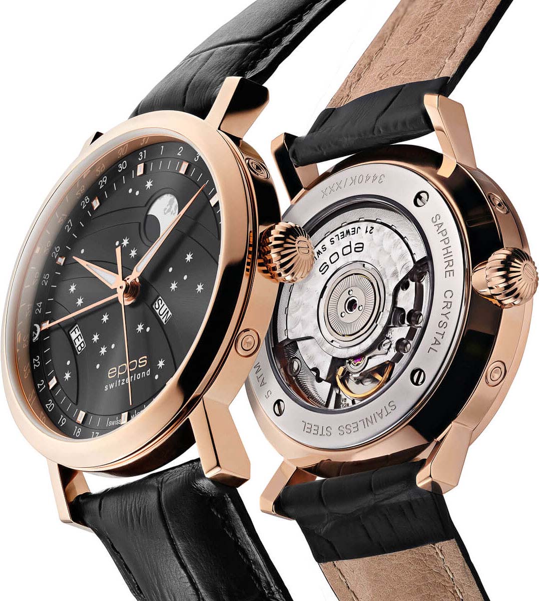 Мужские швейцарские механические часы с автоподзаводом Epos Big Moon 3440.322.24.14.25. Сапфировое стеклоСапфировое стеклоПрочный и надёжный материал из кристалла сапфира синтетического происхождения, характеризующийся особой твёрдостью и устойчивостью к царапинам и повреждениям. устойчивое к появлению царапин, обладающее высокой прозрачностью. Корпус часов изготовлен из нержавеющей стали с PVD-покрытиемPVDУльтратонкое покрытие наносится в технике вакуумного напыления, сочетает в себе нитрид титана особой прочности со слоем золота или оксида хрома. Несёт в себе декоративную или защитную функцию.. Стрелки и метки с люминесцентной подсветкойЛюминесцентное покрытиеПозволяет считывать показания времени в темноте. Производители наносят на стрелки, часовые индексы, безель или поверхность циферблата светонакопительный состав, дающий холодное свечение.. Циферблат с метками в виде точек. Дата отображается центральной стрелкой. Окошки для дня недели и месяца, индикатор фазы Луны. Часовой механизм декорирован жемчужной фактурной шлифовкой (Le Perlage). Прозрачная задняя крышка. Класс водозащиты: 50 метров, позволит защитить корпус от случайных брызг или капель дождя. Кожаный ремешок на стандартной застёжке.