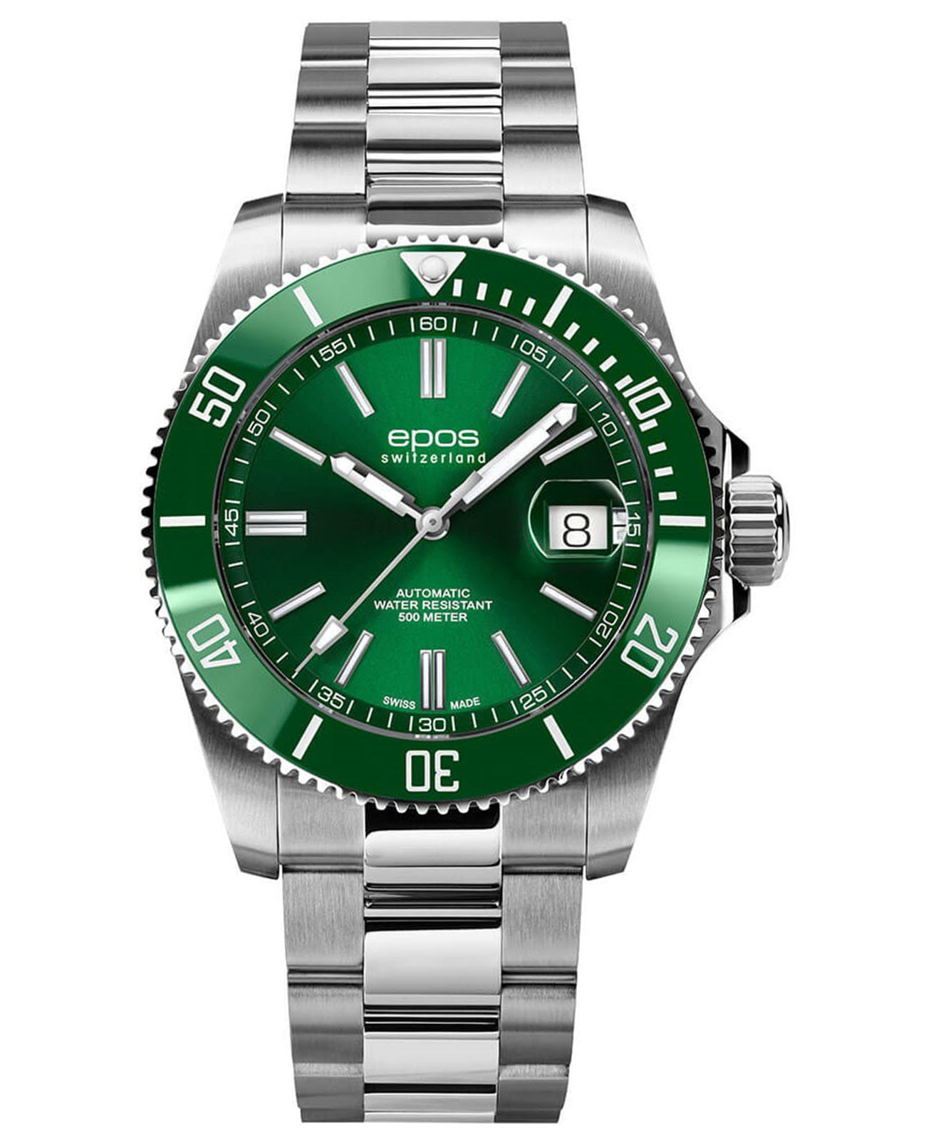 Мужские швейцарские механические часы с автоподзаводом Epos Diver 3504.131.93.13.30. Сапфировое стеклоСапфировое стеклоПрочный и надёжный материал из кристалла сапфира синтетического происхождения, характеризующийся особой твёрдостью и устойчивостью к царапинам и повреждениям. устойчивое к появлению царапин, обладающее высокой прозрачностью. Корпус и браслет часов изготовлен из нержавеющей стали. Врачающийся в одном направлении безельБезельВнешний ободок, закрепляющий стекло. В спортивных часах так называется поворотное кольцо с делениями на циферблате, выполняет роль таймера – замеряет отрезки времени на шкале. Неподвижный безель – элемент декора. Однонаправленно вращающийся безель на дайверских часах позволяет фиксировать моменты погружения и выныривания на поверхность. из нержавеющей стали с PVDPVDУльтратонкое покрытие наносится в технике вакуумного напыления, сочетает в себе нитрид титана особой прочности со слоем золота или оксида хрома. Несёт в себе декоративную или защитную функцию. покрытием. Лупа над окошком даты. Прозрачная задняя крышка. Завинчивающаяся заводная головка. Класс водозащиты: 500 метров, позволит плавать, нырять и заниматься другими водными видами спорта. Стальной браслет на раскладной застёжкеРаскладная застёжкаТакой тип застёжки используется только на браслетах из металла. Она никогда не раскрывается полностью, происходит разделение на 2 и более частей. Раскладывающая застёжка снизит вероятность потери часов к минимуму..