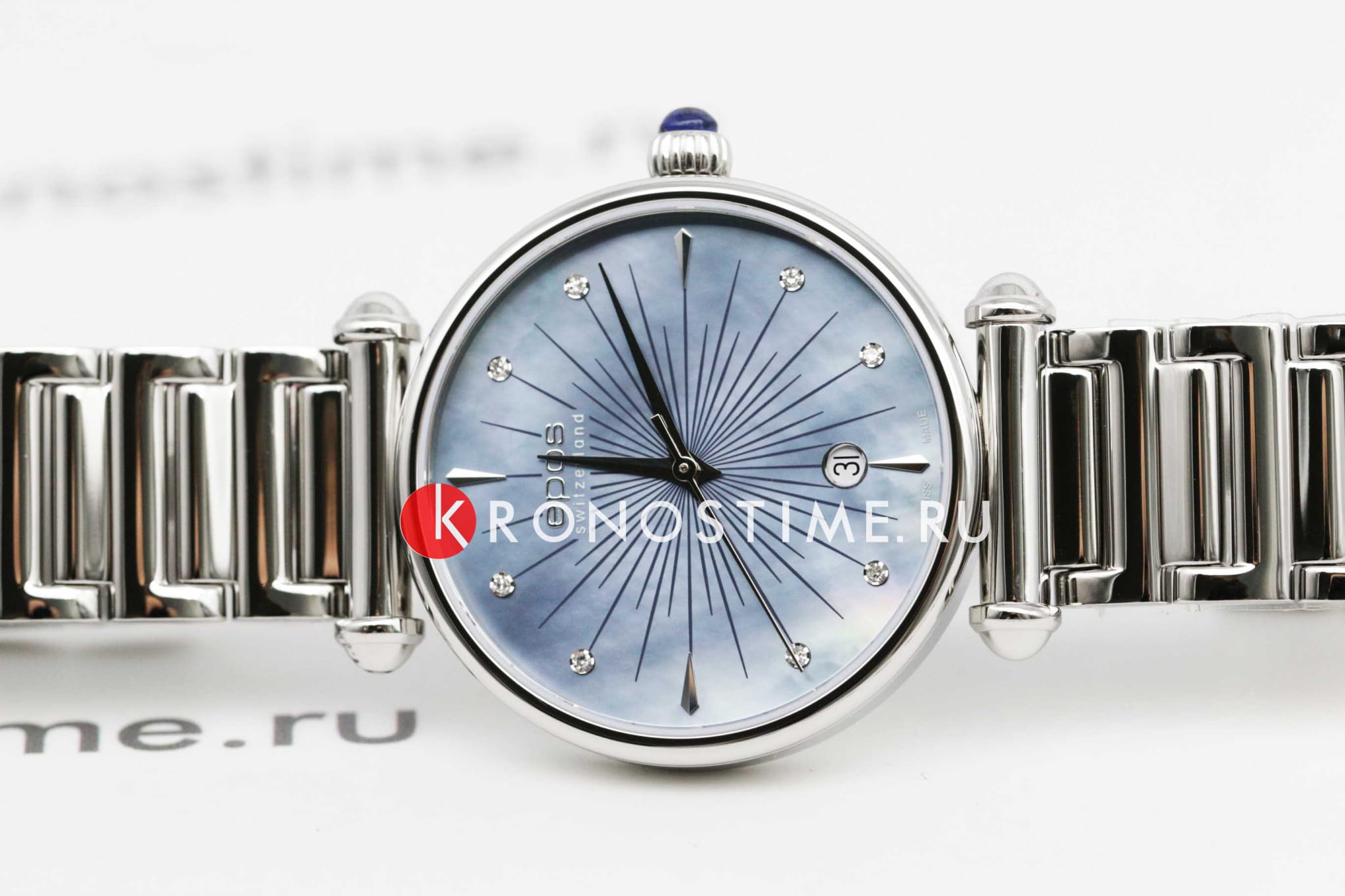 Женские швейцарские часы с бриллиантами Epos Ladies Quartz 8000.700.20.96.30, кварцевый механизм с высокой точностью. Сапфировое стеклоСапфировое стеклоПрочный и надёжный материал из кристалла сапфира синтетического происхождения, характеризующийся особой твёрдостью и устойчивостью к царапинам и повреждениям. устойчивое к появлению царапин, обладающее высокой прозрачностью. Класс водозащиты: 30 метров, позволит защитить корпус от случайных брызг или капель дождя. Корпус часов изготовлен из стали. Браслет с застёжкой-бабочкой с кнопкамиЗастёжка "бабочка"Такой вид застёжки дополняется предохранителями, помогающими избежать случайного раскрытия браслета. Обладают изящным исполнением. . Заводная головка украшена сапфиром в форме кабошона.