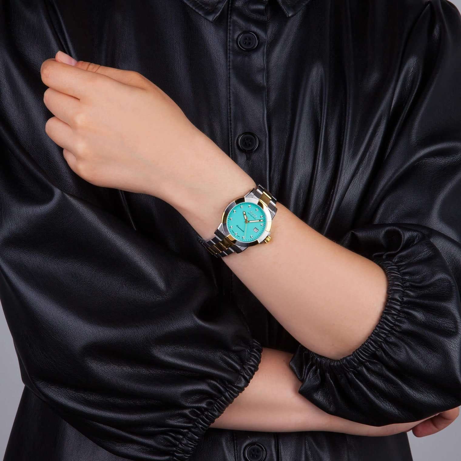 Женские кварцевые часы Epos из коллекции Ladies Diamonds — это элегантный аксессуар, сочетающий швейцарское качество и изысканный дизайн. Корпус диаметром 36 мм и толщиной 9 мм выполнен из нержавеющей стали 316L, безель с частичным PVD-покрытиемPVDУльтратонкое покрытие наносится в технике вакуумного напыления, сочетает в себе нитрид титана особой прочности со слоем золота или оксида хрома. Несёт в себе декоративную или защитную функцию. розового золота. Циферблат с перламутровой вставкой бирюзового оттенка выполнен по технологии «солнечные лучи» и украшен синтетическими бриллиантами. Циферблат защищён сапфировым стекломСапфировое стеклоПрочный и надёжный материал из кристалла сапфира синтетического происхождения, характеризующийся особой твёрдостью и устойчивостью к царапинам и повреждениям.. Метки в виде точек инкрустированы бриллиантами. Стрелки с люминесцентным покрытиемЛюминесцентное покрытиеПозволяет считывать показания времени в темноте. Производители наносят на стрелки, часовые индексы, безель или поверхность циферблата светонакопительный состав, дающий холодное свечение., обеспечивающим хорошую читаемость в темноте. Окошко даты расположено в положении 3 часов. Механизм — швейцарский кварцевый калибр Ronda 705. Часы оснащены стальным браслетом комбинированного цвета на раскладной застёжкеРаскладная застёжкаТакой тип застёжки используется только на браслетах из металла. Она никогда не раскрывается полностью, происходит разделение на 2 и более частей. Раскладывающая застёжка снизит вероятность потери часов к минимуму.. Водонепроницаемость 50 м позволяет использовать часы в повседневных условиях.