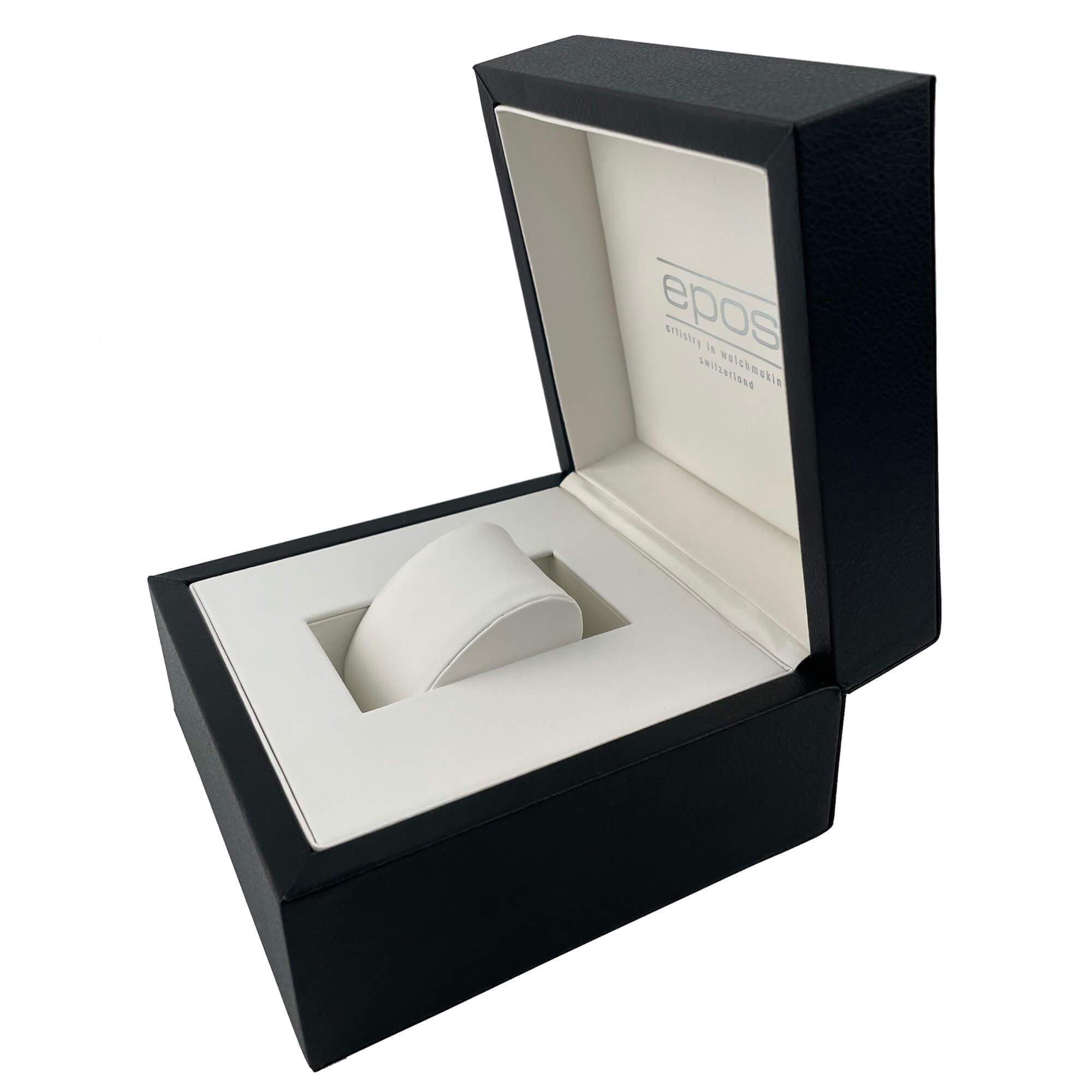 Epos 8002.702.24.26.16 — женская модель с утончённым классическим стилем и прямоугольным корпусом, выполненным из нержавеющей стали с PVD-покрытиемPVDУльтратонкое покрытие наносится в технике вакуумного напыления, сочетает в себе нитрид титана особой прочности со слоем золота или оксида хрома. Несёт в себе декоративную или защитную функцию.. Черный циферблат оформлен римскими индексами и утончённым узором «Clous de Paris», создающим игру света и подчёркивающим глубину дизайна. Защитную функцию выполняет сапфировое стеклоСапфировое стеклоПрочный и надёжный материал из кристалла сапфира синтетического происхождения, характеризующийся особой твёрдостью и устойчивостью к царапинам и повреждениям., стойкое к царапинам и сохраняющее прозрачность. В основе лежит швейцарский автоматический механизм, обеспечивающий стабильность и точность хода. Функции включают индикацию часов, минут и малую секундную шкалу, расположенную в позиции «6 часов». Часы дополнены кожаным ремешком, который гармонично завершает строгий образ модели.