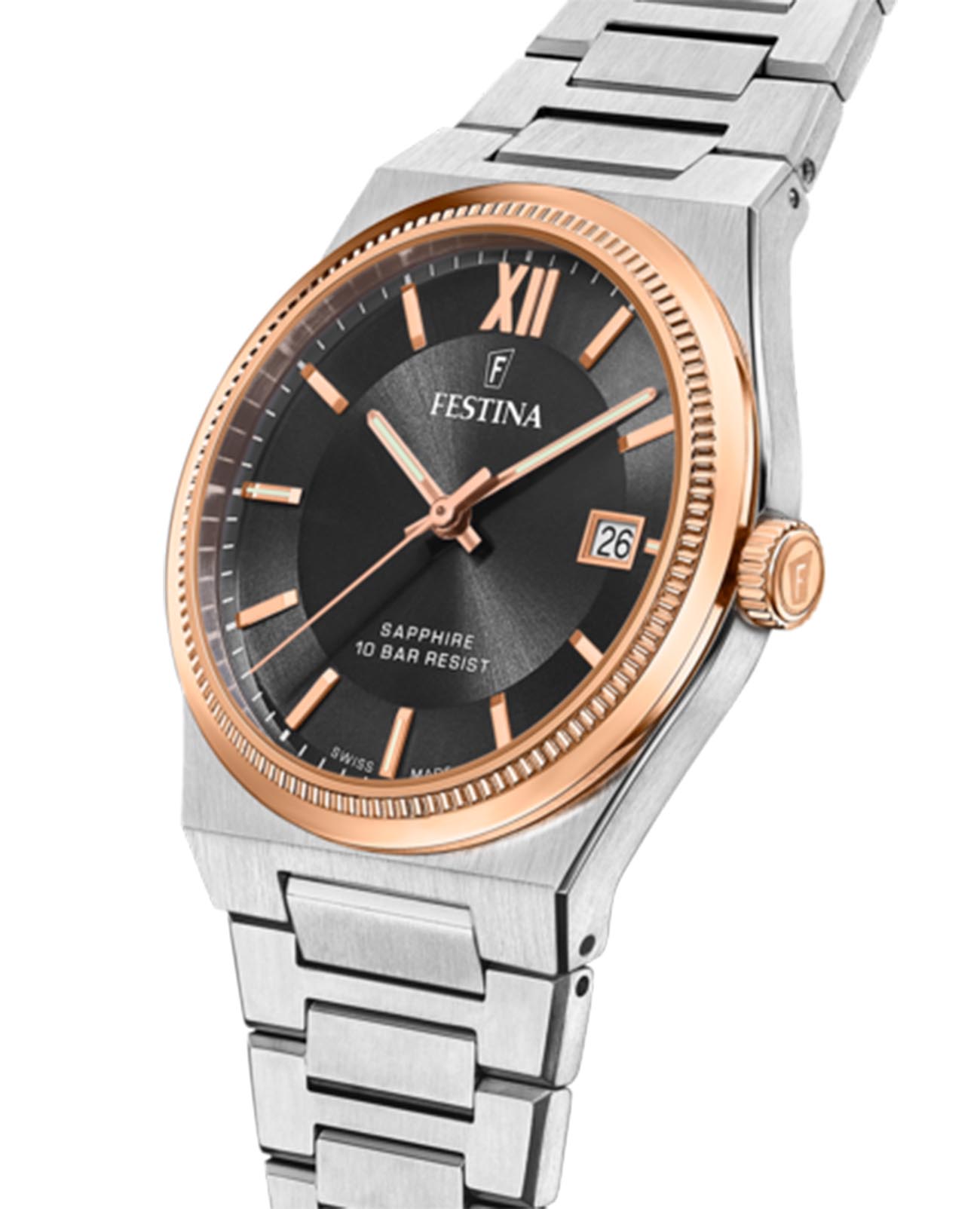 Мужские наручные часы Festina F20036/3. Кварцевый механизм с высокой точностью. Сапфировое стеклоСапфировое стеклоПрочный и надёжный материал из кристалла сапфира синтетического происхождения, характеризующийся особой твёрдостью и устойчивостью к царапинам и повреждениям. устойчивое к появлению царапин, обладающее высокой прозрачностью. Класс водозащиты: 100 метров, позволит плавать, нырять и заниматься другими водными видами спорта. Корпус часов изготовлен из нержавеющей стали. Стальной браслет застёжке-бабочке. Стрелки с люминесцентным покрытиемЛюминесцентное покрытиеПозволяет считывать показания времени в темноте. Производители наносят на стрелки, часовые индексы, безель или поверхность циферблата светонакопительный состав, дающий холодное свечение.. Окошко даты находится в положении 3 часа. БезельБезельВнешний ободок, закрепляющий стекло. В спортивных часах так называется поворотное кольцо с делениями на циферблате, выполняет роль таймера – замеряет отрезки времени на шкале. Неподвижный безель – элемент декора. Однонаправленно вращающийся безель на дайверских часах позволяет фиксировать моменты погружения и выныривания на поверхность. с IP-покрытиемIP-покрытиеМетод ионного напыления. Демонстрирует повышенную устойчивость к истиранию, окислению и химическим веществам. Под воздействием высокого давления и температуры около 1500°C молекулы металла надёжно соединяются с частицами корпуса часов..
