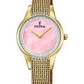 Яркий стиль и функциональность этих часов придутся по душе активной девушке. Кварцевый механизм с высокой точностью. Минеральное стеклоМинеральное стеклоМинеральное стекло представляет собой искусственно выращенный минерал кварца. Такое стекло отличается особой устойчивостью к повреждениям и царапинам. Уступает по некоторым качествам сапфировому стеклу. устойчивое к появлению царапин, обладающее высокой прозрачностью. Класс водозащиты: 50 метров, позволит защитить корпус от случайных брызг или капель дождя. Корпус часов изготовлен из нержавеющей стали с PVD-покрытиемPVDУльтратонкое покрытие наносится в технике вакуумного напыления, сочетает в себе нитрид титана особой прочности со слоем золота или оксида хрома. Несёт в себе декоративную или защитную функцию.. Стальной браслет миланского плетения на раскладном замкеРаскладной замокДанный вариант застежки используется только на часах с металлическим браслетом. Отличительная особенность такого крепления в том, что длина браслета становится универсальной и вы можете самостоятельно отрегулировать нужный вам размер – застежка просто двигается по браслету часов. с PVD-покрытиемPVDУльтратонкое покрытие наносится в технике вакуумного напыления, сочетает в себе нитрид титана особой прочности со слоем золота или оксида хрома. Несёт в себе декоративную или защитную функцию..