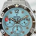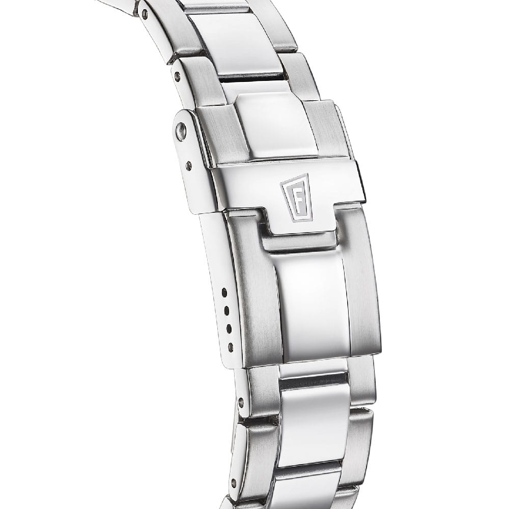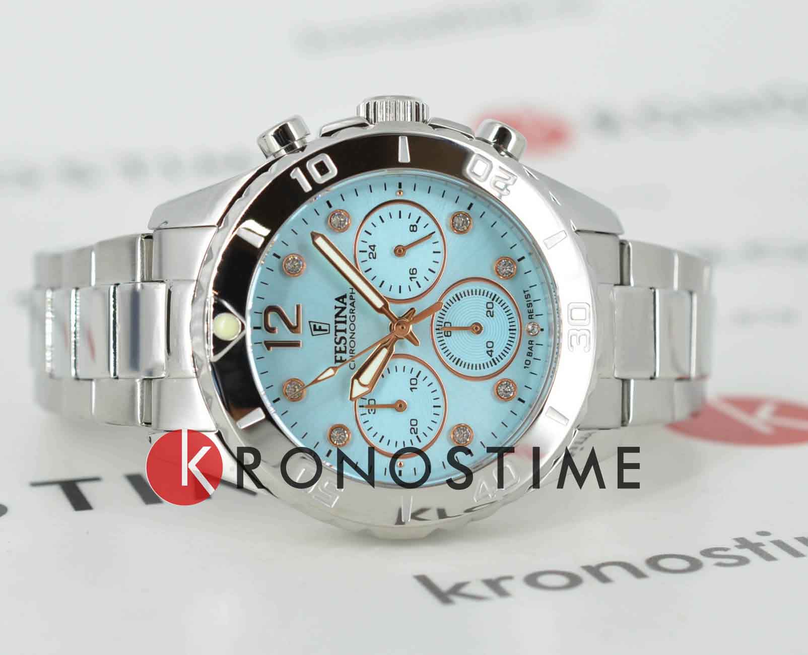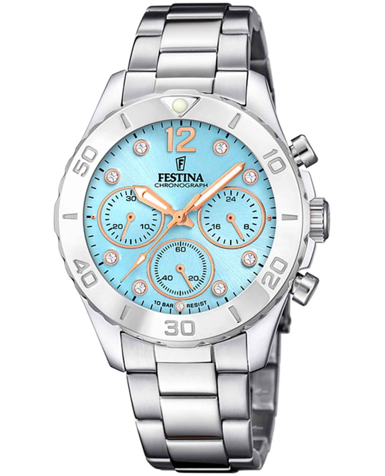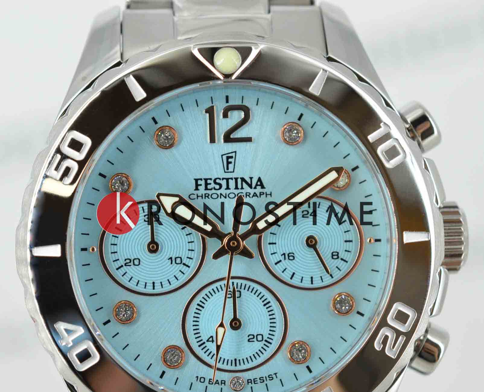Festina F20603/4 — это часы, которые сочетают в себе яркий стиль, элегантность и современную функциональность, что непременно придётся по вкусу активной девушке, ведущей динамичный образ жизни. Модель оснащена функцией хронографаХронографФункция позволяет измерять отрезки времени с особой точностью: часы, минуты, секунды. Верным признаком хронографа является наличие на циферблате 3 дополнительных окошек-счётчиков. с дополнительными функциями секундомераСекундомерСекундоме́р — прибор, способный измерять интервалы времени с точностью до долей секунды., позволяющей точно измерять промежутки времени, а высокоточный кварцевый механизм гарантирует надежность и стабильную работу часов в любых условиях. Минеральное стеклоМинеральное стеклоМинеральное стекло представляет собой искусственно выращенный минерал кварца. Такое стекло отличается особой устойчивостью к повреждениям и царапинам. Уступает по некоторым качествам сапфировому стеклу. обеспечивает эффективную защиту от царапин и отличается высокой прозрачностью, что делает показания циферблата легко читаемыми. Голубой циферблат придаёт особый шарм, а метки, украшенные инкрустированные фианитами, добавляют изысканности и женственности. Класс водозащиты 100 метров позволяет не снимать часы при плавании, нырянии и занятиях водными видами спорта. Прочный корпус из нержавеющей стали гарантирует долговечность, а безельБезельВнешний ободок, закрепляющий стекло. В спортивных часах так называется поворотное кольцо с делениями на циферблате, выполняет роль таймера – замеряет отрезки времени на шкале. Неподвижный безель – элемент декора. Однонаправленно вращающийся безель на дайверских часах позволяет фиксировать моменты погружения и выныривания на поверхность. и браслет с раскладной застёжкойРаскладная застёжкаТакой тип застёжки используется только на браслетах из металла. Она никогда не раскрывается полностью, происходит разделение на 2 и более частей. Раскладывающая застёжка снизит вероятность потери часов к минимуму. обеспечивают дополнительный комфорт в носке.