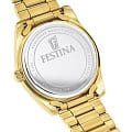 Наручные женские часы с минеральным стекломМинеральное стеклоМинеральное стекло представляет собой искусственно выращенный минерал кварца. Такое стекло отличается особой устойчивостью к повреждениям и царапинам. Уступает по некоторым качествам сапфировому стеклу. Festina Boyfriend F20640/7, кварцевый механизм с высокой точностью. Класс водозащиты: 50 метров, позволит защитить корпус от случайных брызг или капель дождя. Корпус часов изготовлен из стали с позолотой. Стальной браслет на раскладной застёжкеРаскладная застёжкаТакой тип застёжки используется только на браслетах из металла. Она никогда не раскрывается полностью, происходит разделение на 2 и более частей. Раскладывающая застёжка снизит вероятность потери часов к минимуму.. Стрелки и метки с люминесцентным покрытиемЛюминесцентное покрытиеПозволяет считывать показания времени в темноте. Производители наносят на стрелки, часовые индексы, безель или поверхность циферблата светонакопительный состав, дающий холодное свечение..
