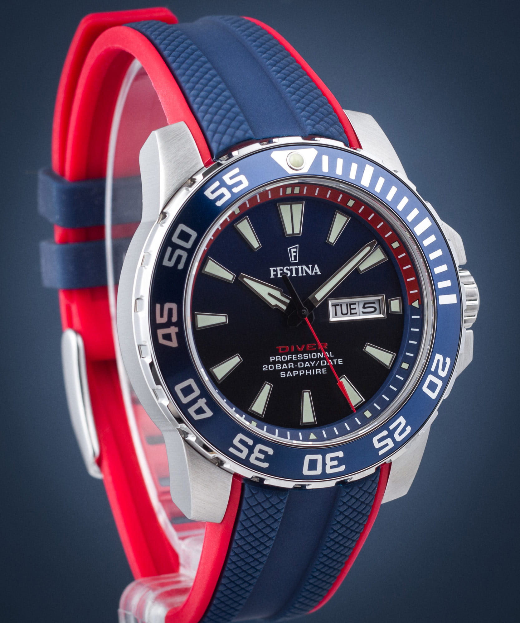 Мужские часы Festina The originals F20662/1, кварцевый механизм с высокой точностью. Сапфировое стеклоСапфировое стеклоПрочный и надёжный материал из кристалла сапфира синтетического происхождения, характеризующийся особой твёрдостью и устойчивостью к царапинам и повреждениям. устойчивое к появлению царапин, обладающее высокой прозрачностью. Класс водозащиты: 200 метров, позволит плавать, нырять и заниматься другими водными видами спорта. Корпус часов изготовлен из нержавеющей стали. Каучуковый ремешок с красной подкладкой на стандартной застёжке. Окошки дня недели и даты находятся в положении 3 часа. Вращающийся стальной безельБезельВнешний ободок, закрепляющий стекло. В спортивных часах так называется поворотное кольцо с делениями на циферблате, выполняет роль таймера – замеряет отрезки времени на шкале. Неподвижный безель – элемент декора. Однонаправленно вращающийся безель на дайверских часах позволяет фиксировать моменты погружения и выныривания на поверхность. с IP-покрытиемIP-покрытиеМетод ионного напыления. Демонстрирует повышенную устойчивость к истиранию, окислению и химическим веществам. Под воздействием высокого давления и температуры около 1500°C молекулы металла надёжно соединяются с частицами корпуса часов.. Стрелки и метки с люминесцентным покрытиемЛюминесцентное покрытиеПозволяет считывать показания времени в темноте. Производители наносят на стрелки, часовые индексы, безель или поверхность циферблата светонакопительный состав, дающий холодное свечение..