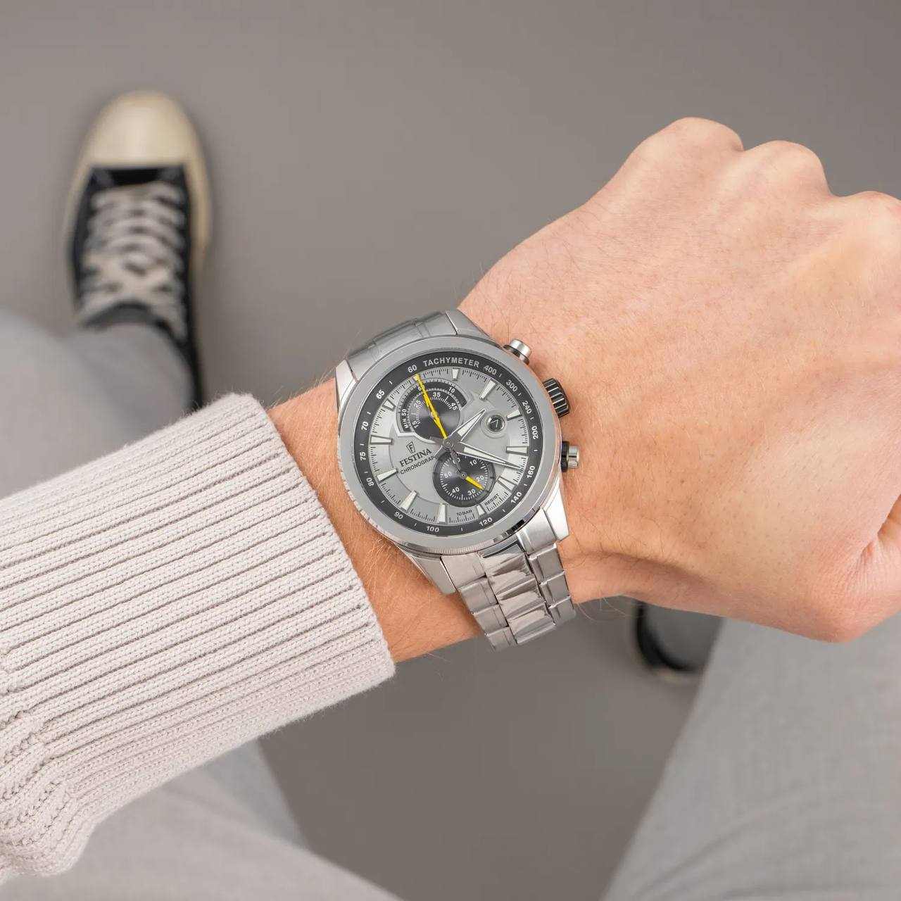 Часы Festina Timeless Chronograph F20694/4 представляют собой сочетание изысканного дизайна и современных технологий, создающих идеальный аксессуар для тех, кто ценит стиль и функциональность. Эти часы оснащены надежным кварцевым механизмом, который обеспечивает безупречную точность хода, а наличие хронографаХронографФункция позволяет измерять отрезки времени с особой точностью: часы, минуты, секунды. Верным признаком хронографа является наличие на циферблате 3 дополнительных окошек-счётчиков. с секундомеромСекундомерСекундоме́р — прибор, способный измерять интервалы времени с точностью до долей секунды. позволяет измерять промежутки времени с высочайшей точностью, что делает их неотъемлемым атрибутом для активных и целеустремленных людей. На серебристый циферблат нанесена шкала тахиметраТахиметрРазмеченная шкала, располагается на ободке или безеле часов. Тахиметр позволяет рассчитать скорость на определённом участке пути, расстояние измеряется в километрах или милях.. Стрелки и метки, покрытые люминесцентным покрытиемЛюминесцентное покрытиеПозволяет считывать показания времени в темноте. Производители наносят на стрелки, часовые индексы, безель или поверхность циферблата светонакопительный состав, дающий холодное свечение., обеспечивают отличную видимость в условиях низкой освещенности, позволяя вам легко определять время в любой ситуации. Окошко даты, расположенное на отметке «3 часа», поможет вам всегда оставаться в курсе текущих дел. Минеральное стеклоМинеральное стеклоМинеральное стекло представляет собой искусственно выращенный минерал кварца. Такое стекло отличается особой устойчивостью к повреждениям и царапинам. Уступает по некоторым качествам сапфировому стеклу., используемое в конструкции этих часов, отличается повышенной устойчивостью к царапинам и превосходной прозрачностью, гарантируя, что циферблат всегда останется чистым и легко читаемым. Благодаря классу водозащиты до 100 метров, эти часы станут вашим надежным спутником в водных приключениях, позволяя вам свободно плавать, нырять и заниматься другими водными видами спорта. Корпус часов изготовлен из прочной нержавеющей стали, что обеспечивает не только долговечность, но и элегантность внешнего вида. Стальной браслет с раскладной застёжкойРаскладная застёжкаТакой тип застёжки используется только на браслетах из металла. Она никогда не раскрывается полностью, происходит разделение на 2 и более частей. Раскладывающая застёжка снизит вероятность потери часов к минимуму. гарантирует комфортное и безопасное ношение, идеально подходящее для ежедневного использования или специальных случаев.