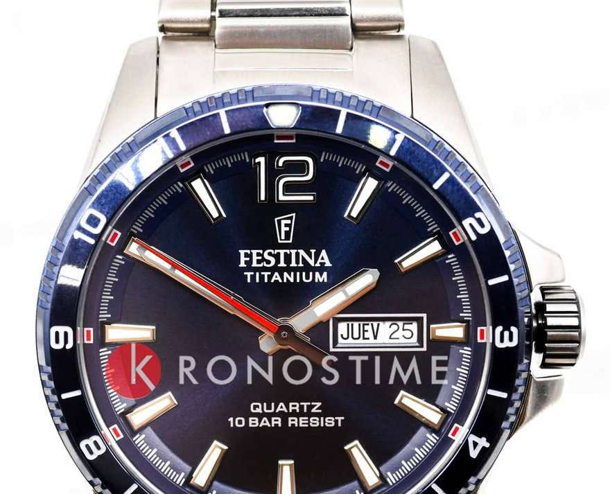 Титановые наручные часы Festina Titanium F20698/2 имеют кварцевый механизм с высокой точностью. Минеральное стеклоМинеральное стеклоМинеральное стекло представляет собой искусственно выращенный минерал кварца. Такое стекло отличается особой устойчивостью к повреждениям и царапинам. Уступает по некоторым качествам сапфировому стеклу. устойчивое к появлению царапин, обладающее высокой прозрачностью, защищает синий циферблат. БезельБезельВнешний ободок, закрепляющий стекло. В спортивных часах так называется поворотное кольцо с делениями на циферблате, выполняет роль таймера – замеряет отрезки времени на шкале. Неподвижный безель – элемент декора. Однонаправленно вращающийся безель на дайверских часах позволяет фиксировать моменты погружения и выныривания на поверхность. с часовыми метками выполнен из нержавеющей стали с синим PVDPVDУльтратонкое покрытие наносится в технике вакуумного напыления, сочетает в себе нитрид титана особой прочности со слоем золота или оксида хрома. Несёт в себе декоративную или защитную функцию. покрытием. Класс водозащиты: 100 метров, позволит плавать, нырять и заниматься другими водными видами спорта. Корпус часов изготовлен из титана, браслет также изготовлен из титана и имеет раскладную застёжкуРаскладная застёжкаТакой тип застёжки используется только на браслетах из металла. Она никогда не раскрывается полностью, происходит разделение на 2 и более частей. Раскладывающая застёжка снизит вероятность потери часов к минимуму.. Люминесцентное покрытиеЛюминесцентное покрытиеПозволяет считывать показания времени в темноте. Производители наносят на стрелки, часовые индексы, безель или поверхность циферблата светонакопительный состав, дающий холодное свечение. на стрелках и метках обеспечивает отличную видимость в темноте, а окошко даты с днем недели, расположенное в позиции 3 часа, добавляет практичности.
