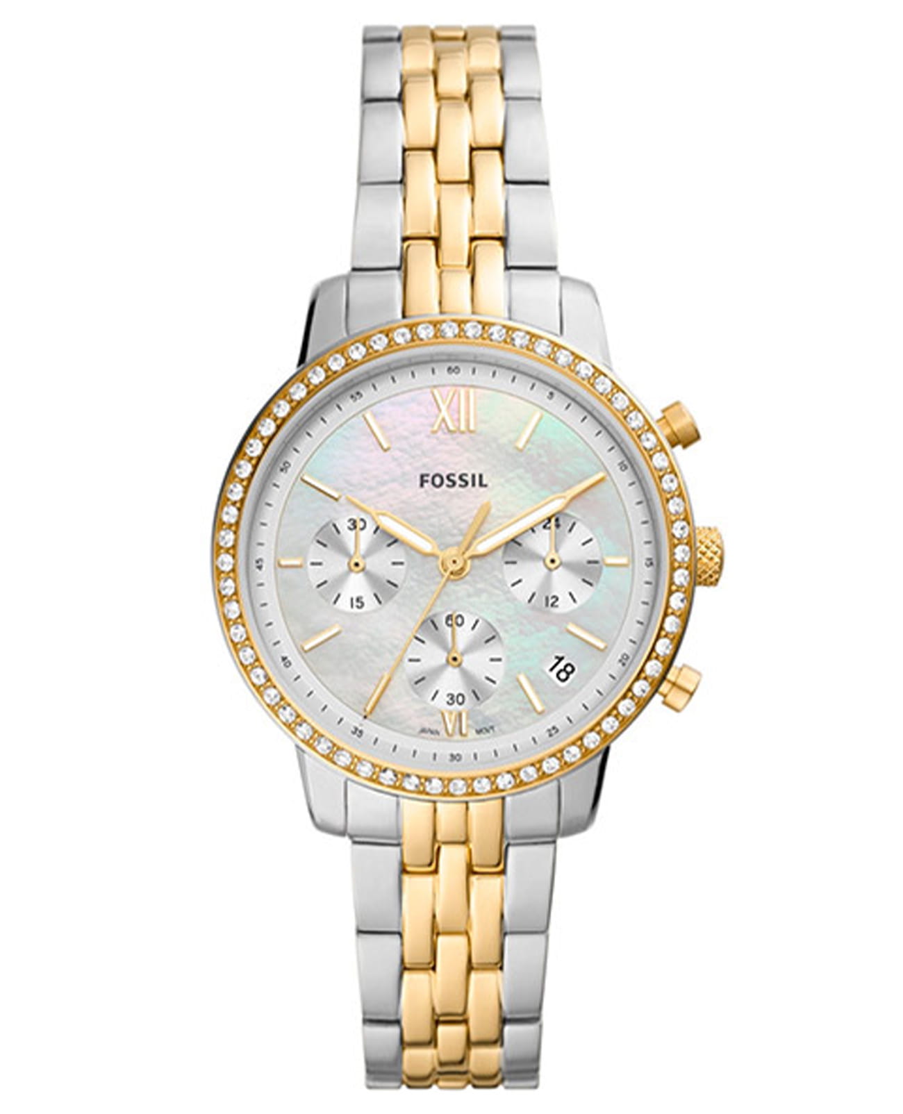 Женские американские часы-хронографХронографФункция позволяет измерять отрезки времени с особой точностью: часы, минуты, секунды. Верным признаком хронографа является наличие на циферблате 3 дополнительных окошек-счётчиков. с секундомеромСекундомерСекундоме́р — прибор, способный измерять интервалы времени с точностью до долей секунды. Fossil Neutra ES5216, кварцевый механизм с высокой точностью. Класс водозащиты: 50 метров, позволит защитить корпус от случайных брызг или капель дождя. Корпус и браслет часов изготовлен из стали с частичным IP-покрытиемIP-покрытиеМетод ионного напыления. Демонстрирует повышенную устойчивость к истиранию, окислению и химическим веществам. Под воздействием высокого давления и температуры около 1500°C молекулы металла надёжно соединяются с частицами корпуса часов.. Система отображения времени 12-ти и 24-х часового формата. БезельБезельВнешний ободок, закрепляющий стекло. В спортивных часах так называется поворотное кольцо с делениями на циферблате, выполняет роль таймера – замеряет отрезки времени на шкале. Неподвижный безель – элемент декора. Однонаправленно вращающийся безель на дайверских часах позволяет фиксировать моменты погружения и выныривания на поверхность. украшен кристаллами. Циферблат перламутровый серебристый с окошком даты между 4 и 5 часами.