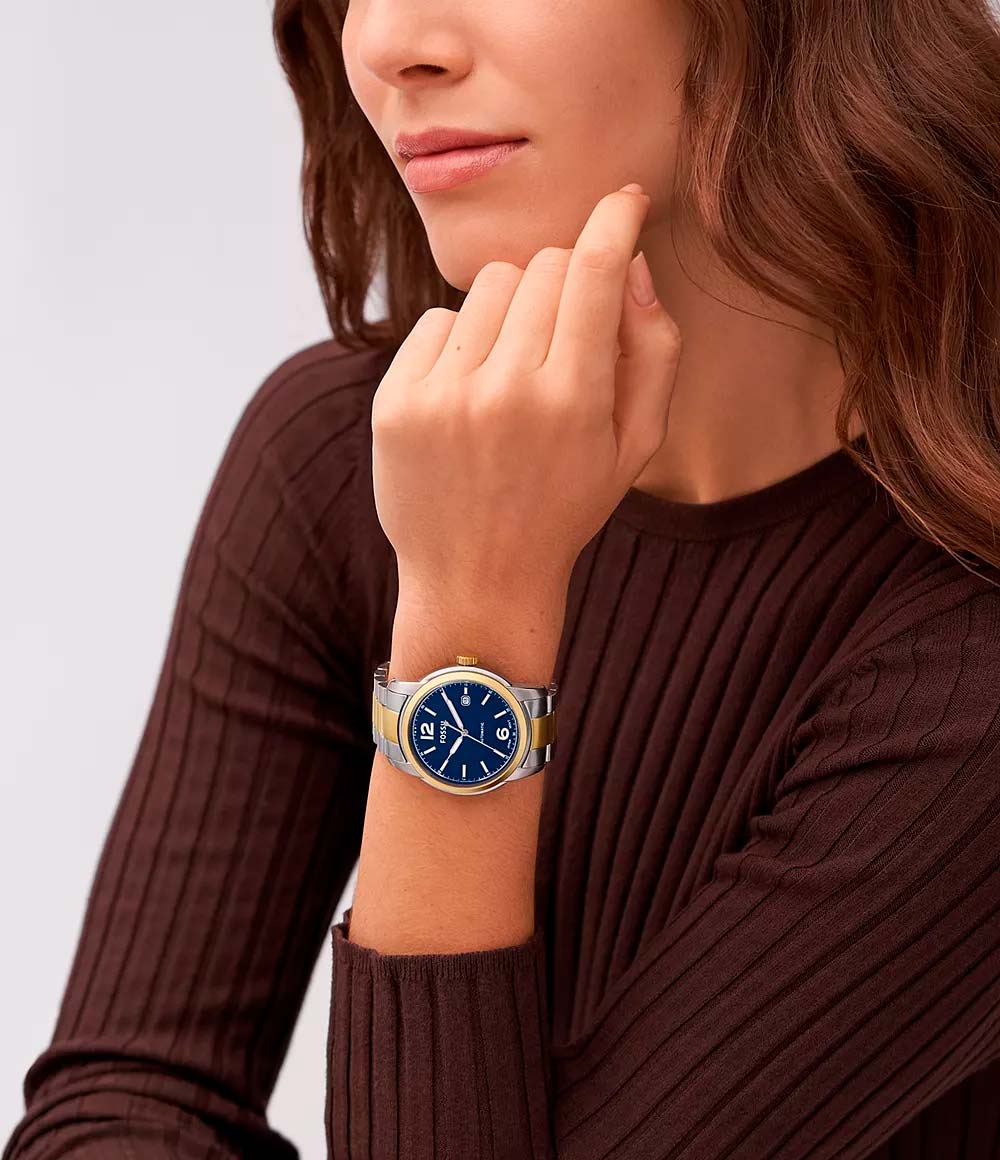 Наручные часы Fossil Heritage ME3230 с надёжным автоматическим механизмом. Корпус и браслет часов изготовлены из нержавеющей стали с частичным IP-покрытиемIP-покрытиеМетод ионного напыления. Демонстрирует повышенную устойчивость к истиранию, окислению и химическим веществам. Под воздействием высокого давления и температуры около 1500°C молекулы металла надёжно соединяются с частицами корпуса часов.. Минеральное стеклоМинеральное стеклоМинеральное стекло представляет собой искусственно выращенный минерал кварца. Такое стекло отличается особой устойчивостью к повреждениям и царапинам. Уступает по некоторым качествам сапфировому стеклу. устойчивое к мелким механическим повреждениям. Стальной браслет на раскладной застёжкеРаскладная застёжкаТакой тип застёжки используется только на браслетах из металла. Она никогда не раскрывается полностью, происходит разделение на 2 и более частей. Раскладывающая застёжка снизит вероятность потери часов к минимуму.. Класс водозащиты: 50 метров, позволит защитить корпус от случайных брызг или капель дождя. Стрелки и метки с люминесцентным покрытиемЛюминесцентное покрытиеПозволяет считывать показания времени в темноте. Производители наносят на стрелки, часовые индексы, безель или поверхность циферблата светонакопительный состав, дающий холодное свечение.. Окошко даты находится в положении 3 часа.