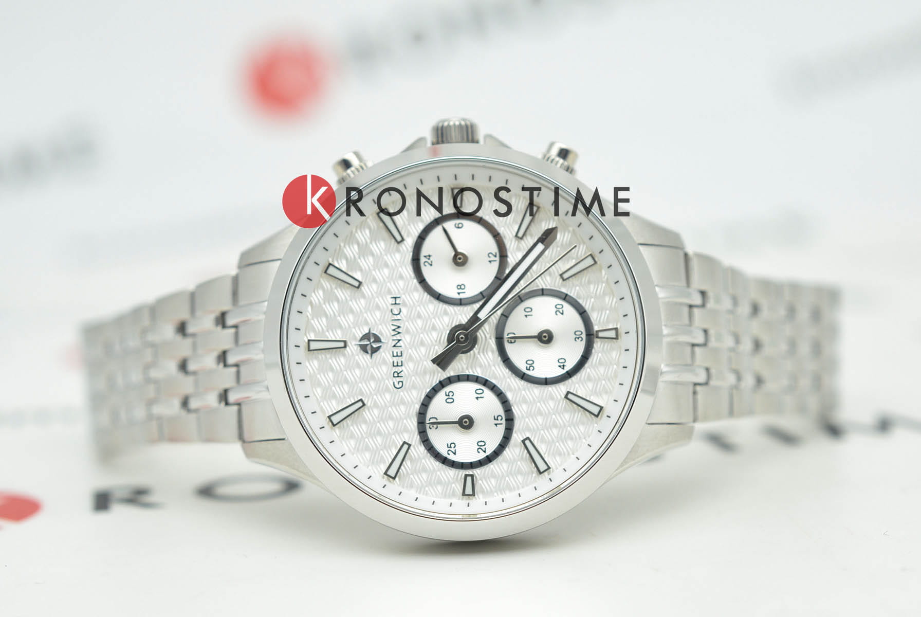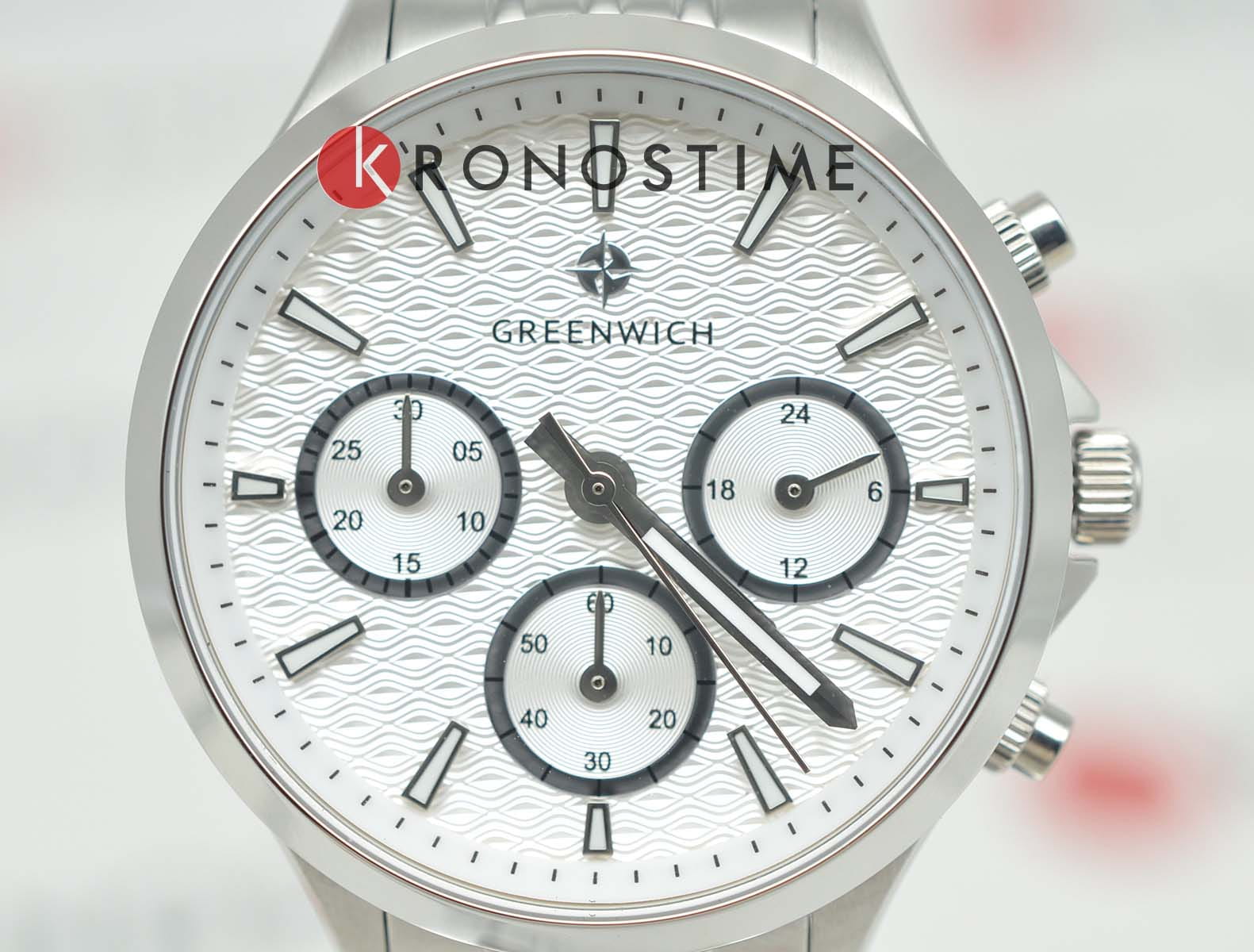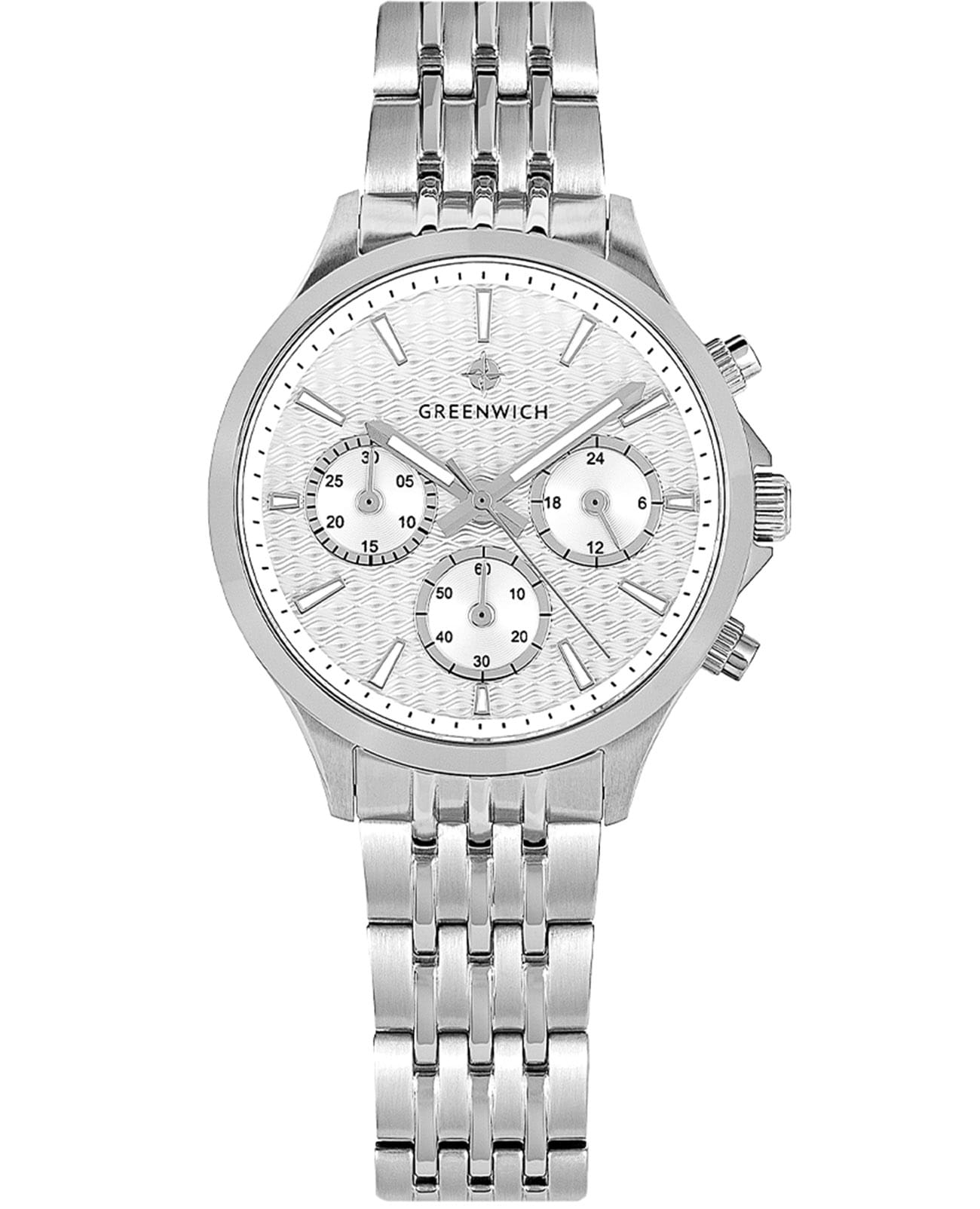Женские кварцевые часы Greenwich — это сочетание элегантности и функциональности. Корпус диаметром 35 мм выполнен из нержавеющей стали. Циферблат белого цвета оформлен с эффектом гильоше в виде волнообразных линий, придающим ему объём и глубину. На циферблате расположены субциферблаты хронографа (секундомер на 60 секунд и 30 минут) и индикатор 24-часового формата. Окошко даты находится в положении 3 часов. Все индикаторы выделены рамками с зеркальной полировкой. Стрелки и метки с люминесцентным покрытиемЛюминесцентное покрытиеПозволяет считывать показания времени в темноте. Производители наносят на стрелки, часовые индексы, безель или поверхность циферблата светонакопительный состав, дающий холодное свечение., обеспечивающим хорошую читаемость в темноте. Циферблат защищён минеральным стекломМинеральное стеклоМинеральное стекло представляет собой искусственно выращенный минерал кварца. Такое стекло отличается особой устойчивостью к повреждениям и царапинам. Уступает по некоторым качествам сапфировому стеклу.. Механизм — кварцевый калибр Miyota с функцией хронографа. Часы оснащены стальным браслетом с комбинированной полировкой (матовые и зеркальные звенья) и удобной раскладной застёжкойРаскладная застёжкаТакой тип застёжки используется только на браслетах из металла. Она никогда не раскрывается полностью, происходит разделение на 2 и более частей. Раскладывающая застёжка снизит вероятность потери часов к минимуму.. Водонепроницаемость 100 м позволяет использовать часы для плавания и повседневного ношения. Гарантия — 24 месяца. Идеальный выбор для тех, кто ценит стиль, точность и надёжность.