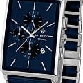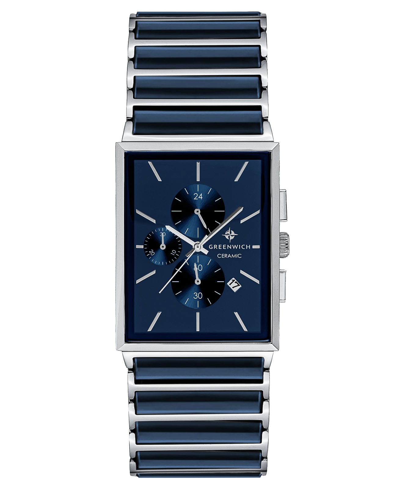 Крупный корпус кварцевых часов сделан из нержавеющей стали. Его форма в виде четкого прямоугольника эффектно смотрится на запястье. На синем циферблате хорошо читаются центральные стрелки часов, минут и секунд и три дополнительных индикатора (минутный, секундный накопители, 24 часа). Контрастное окошко даты находится между рисками 4 и 5 часов. Браслет состоит из звеньев двух видов — внешние из нержавеющей стали, внутренние — из керамики. Керамика хорошо проявляет себя даже при частом использовании, так как быстро нагревается до комфортной температуры тела, не холодит руку даже в мороз. К тому же, керамический браслет легче, чем аналогичный из стали. Его дополняет застежка-клипса с двумя кнопками по бокам.