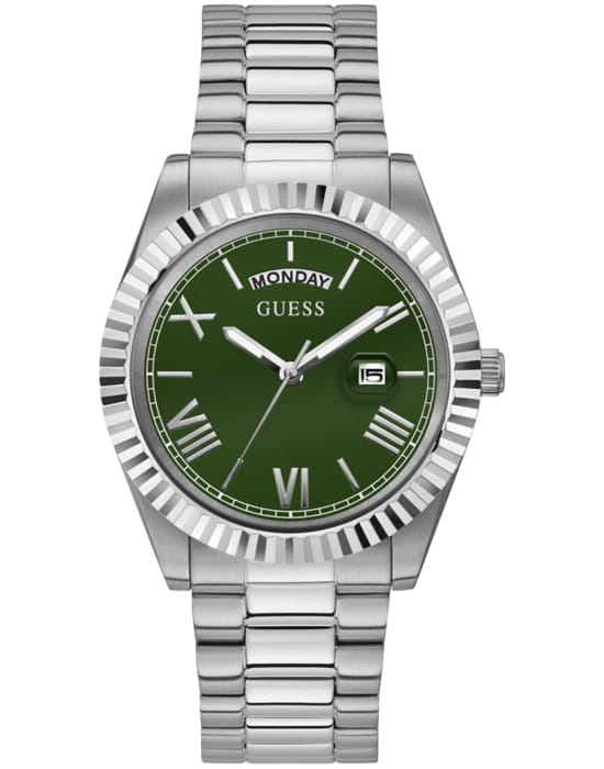 Мужские наручные часы в стиле fashion Guess GW0265G10 с минеральным стекломМинеральное стеклоМинеральное стекло представляет собой искусственно выращенный минерал кварца. Такое стекло отличается особой устойчивостью к повреждениям и царапинам. Уступает по некоторым качествам сапфировому стеклу., кварцевый механизм с высокой точностью. Класс водозащиты: 50 метров, позволит защитить корпус от случайных брызг или капель дождя. Корпус часов изготовлен из нержавеющей стали. Циферблат выполнен по технологии Sunray (солнечные лучи). Метки в виде штрихов и римских цифр. Окошко даты с увеличительным стеклом. День недели отображается в положении 12 часов. Браслет с раскладной застёжкойРаскладная застёжкаТакой тип застёжки используется только на браслетах из металла. Она никогда не раскрывается полностью, происходит разделение на 2 и более частей. Раскладывающая застёжка снизит вероятность потери часов к минимуму.