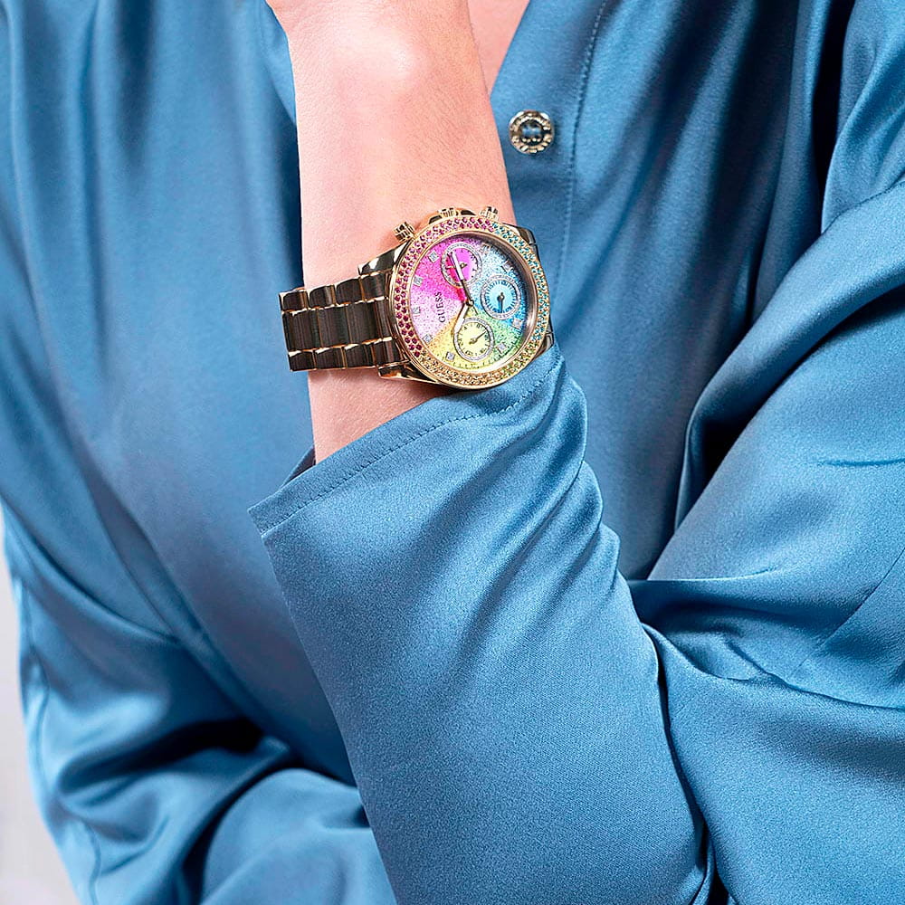 Безукоризненный функциональный аксессуар, сотканный из стали и разноцветных кристаллов, покорит ваше сердце с первого взгляда. Блистательные женские часы Sol. Круглый стальной корпус с IP-покрытиемIP-покрытиеМетод ионного напыления. Демонстрирует повышенную устойчивость к истиранию, окислению и химическим веществам. Под воздействием высокого давления и температуры около 1500°C молекулы металла надёжно соединяются с частицами корпуса часов. украшенный кристаллами. Глиттерный циферблат с метками в виде точек из кристаллов, защинен минеральным стекломМинеральное стеклоМинеральное стекло представляет собой искусственно выращенный минерал кварца. Такое стекло отличается особой устойчивостью к повреждениям и царапинам. Уступает по некоторым качествам сапфировому стеклу., устойчивым к мелким механическим повреждениям. Стрелки и метки с люминесцентным покрытиемЛюминесцентное покрытиеПозволяет считывать показания времени в темноте. Производители наносят на стрелки, часовые индексы, безель или поверхность циферблата светонакопительный состав, дающий холодное свечение..12-ти и 24-х часовой формат времени. Дата и день недели вынесены на отдельные циферблаты. Рифленая заводная головка с защитой. Стальной браслет с раскладной застёжкойРаскладная застёжкаТакой тип застёжки используется только на браслетах из металла. Она никогда не раскрывается полностью, происходит разделение на 2 и более частей. Раскладывающая застёжка снизит вероятность потери часов к минимуму.